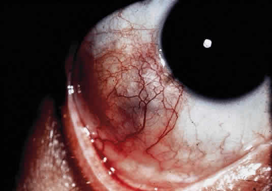 Lens. Two specific types of lenticular changes may be seen: a granular, anterior capsular cataract with a radial pattern and an unusual posterior subcapsular cataract with whitish, translucent spokelike deposits of granular material radiating from the central part of the posterior cortex. Retina. Fundus lesions may be either primary or secondary to systemic hypertension or renal disease. The first alterations occur in the veins, which assume a tortuous appearance; later, in the second decade of life, they may show segmentation and dilatation. The arteries also become tortuous and show sheathing and generalized or localized dilatations. Other findings include papilledema, optic atrophy, lid edema, and angiokeratoma of the lids. The neurologic sequelae are protean and are the result of cerebrovascular involvement. DIAGNOSIS. The enzyme deficiency can be diagnosed in tears,162 serum, urinary sediment, leukocytes, or cultured fibroblasts.163 Conjunctival biopsy may be of value and should be strongly considered in these patients.161 It is important to diagnose Fabry's disease in carriers for the purpose of genetic counseling; such diagnoses must be based on family history and examination of family members. Where a high index of suspicion is present, conjunctival biopsy and examination of the urine for excess glycolipids are indicated. DIFFERENTIAL DIAGNOSES. A number of drugs can produce vortex patterns in the superficial cornea: quinacrine, chloroquine, hydroxychloroquine sulfate, amiodarone, indomethacin, and chlorpromazine. In chloroquine keratopathy, the radiating lines are more pronounced in the lower half of the cornea. Striate melanokeratosis may have a vortex pattern but is usually found in more heavily or darkly pigmented eyes,164 and is associated with uveitis and keratitis. Corneal verticillata, a familial whorl-like corneal opacity, is actually the expression of Fabry's disease in otherwise asymptomatic heterozygotes.159 The ocular pathology of a hemizygous male with Fabry's disease, who died after renal transplantation, revealed reduplication of the corneal basement membrane as well as osmophilic inclusion bodies in both epithelial and endothelial cells.165 It is thus plausible that the diffuse haziness of the cornea seen on slit lamp examination is caused by epithelial deposits of lipid, and that reduplication of the basement membrane is responsible for whorl-like dystrophy. MANAGEMENT. Neither the corneal lesion nor the cataract affects visual acuity. The frequency and intensity of the pain crisis can be decreased with chronic use of phenytoin and carbamazepine. Hemodialysis and renal transplant have been successful in saving lives.166 The enzyme is biochemically available, but replacement and specific therapeutic methods for the treatment of the disease are still in experimental stages.156,167 Gaucher's Disease This autosomal-recessive sphingolipidosis is caused by a defect in the enzyme acid α-glucosidase,168 a lysosomal hydrolase encoded by a gene on chromosome 1 (q21 to q31),156,168 which results in the accumulation of glucosylceramide in reticuloendothelial cells. Gaucher's disease is characterized by organomegaly, hematologic problems, and skeletal complications. There are three recognized clinical phenotypes.52 Type I is a chronic, nonneuropathic, adult-onset disorder which accounts for 90% of cases of Gaucher's disease. Splenomegaly, anemia, thrombocytopenia, pathologic bone fractures, episodes of bleeding, and a yellow skin pigmentation are all features of this disease. There is no cerebral involvement. In type II (infantile, acute neuropathic form), afflicted infants fail to thrive and have progressive hepatomegaly, splenomegaly, and dysphagia early in life. Later, persistent retroflexion of the head and signs of pseudobulbar palsy develop. Type III is a subacute, neuropathic form with onset in the teenage years. The neurologic features follow a milder course. OCULAR FINDINGS. A pingueculum-like lesion containing typical Gaucher's cells is the only significant ocular feature169 (Fig. 17). The pingueculum-like mass or thickening of the bulbar conjunctiva in the horizontal meridian, with its base at the limbus, eventually enlarges and assumes a yellow color.170 The nasal and temporal bulbar conjunctiva are involved with equal frequency but only in one fourth of all patients with the chronic form of the disease.