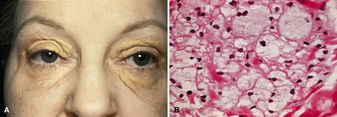 Xanthelasma is a planar xanthoma that can affect both lids. The patches are yellow-orange and slightly elevated (Fig. 11A). In children, xanthelasmas are likely to be associated with increased levels of plasma cholesterol. There is a less clear-cut relationship in adults.120 These lesions are caused by subcuticular lipid-filled macrophages that contain esterified cholesterol as the predominant lipid (see Fig. 11B).121