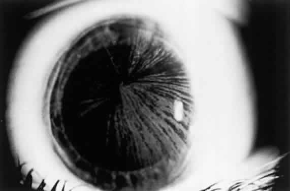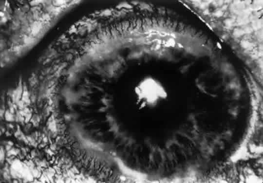 MANAGEMENT. Initial treatment involves controlling the primary inflammatory disease. Argon laser treatment to occlude feeder vessels that have been identified by fluorescein angiography has reportedly been successful in reducing the extent of lipid keratopathy in 62% of cases and its density in 49%.152 Visual acuity was improved in 48% of cases. The use of an Abraham laser lens is important to prevent extensive iris atrophy.153 Complications of corneal argon laser photocoagulation in the treatment of corneal stromal vascularization and secondary lipid keratopathy include iris atrophy, intracorneal hemorrhage, and crystalline deposits.154 Currently, argon laser is seldom used to treat keratopathies. Fabry's Disease Fabry's disease is a lysosomal storage disorder caused by the defective activity of the lysosomal hydrolase α-galactosidase A,155 an enzyme that is encoded on Xq22 (in the long arm of chromosome X).156 This defect leads to the progressive and systematic accumulation of glycosphingolipids, particularly globotriaosylceramide, in vascular endothelial cells and smooth-muscle cells.155–157 Most of these patients have angiokeratomas (telangiectatic lesions of the skin) that appear as purplish-red maculopapular cutaneous nodules in the inguinal, scrotal, and umbilical regions.158 Patients with Fabry's disease may experience severe tingling and burning pains in the hands and feet around the time of puberty. Pain is worse in hot weather and with exercise and may last a number of years. With aging, the onset of atherosclerosis occurs, with a propensity for early myocardial infarction and cerebrovascular problems. However, most patients live until their late 40s, at which time they succumb to renal failure because of lipid in the glomeruli of the kidneys. Female heterozygotes may have some of the manifestations of this disease, but the disease is usually milder in females than in affected males. Fabry's disease is transmitted as an X-linked recessive trait. Of the carrier's sons, 50% are affected, and half of her daughters are carriers. OCULAR FINDINGS. The ocular deposition of this glycosphingolipid results in unique and diagnostic eye findings in both the severely affected homozygous male and the more minimally affected heterozygous carrier female. The ocular findings, which are recognized as one of the distinctive hallmarks of this disease, are among its earliest clinical manifestations.159,160 Cornea. Whorl-like corneal opacities (Fig. 15) are seen in almost all homozygotes and heterozygotes, with more severe involvement in heterozygotes.159 In female carriers, these corneal changes are usually the only manifestations of the disorder. They occur primarily in the subepithelial layers of the cornea, at or near the level of Bowman's layer. These linelike opacities are made up of a multitude of small dots, usually in the cornea. They are mostly cream-colored but range from white to golden brown. The corneal dystrophy (cornea verticillata) appears in a number of patterns. The more fully developed vortex patterns also involve the upper cornea. Lesions appear as a diffuse haze in younger patients and may be seen as early as 6 months of age.161 Corneal dystrophy does not impair visual acuity.159,160 Conjunctival inclusion tortuosities, isolated dilation or saccular aneurysms, as well as sheathing, may be present (Fig. 16).