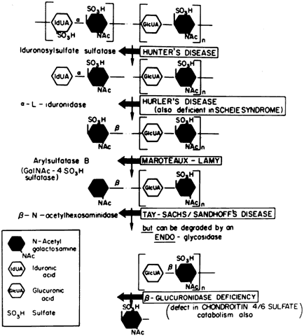 Biopsy of the conjunctival lesions reveals typical Gaucher's cells. In the infantile form, pseudobulbar palsy may cause oculomotor disturbances.171 DIAGNOSIS. Tentative diagnosis is based on the finding of Gaucher's cells in bone marrow. The cytoplasm of these cells has a “wrinkled paper” appearance caused by the deposition of sphingolipid material. Tissue demonstration of decreased levels of glucocerebroside activity confirms the diagnosis. Because 1 of 18 Ashkenazi Jews carries the trait, screening should be carried out in this population. MANAGEMENT. Bone marrow transplantation has been successful in curing some patients with Gaucher's, but the associated mortality and morbidity are too high.172 Enzyme replacement therapy using placental α-glucosidase has been successful. The efficacy of the recombinant enzyme is currently being studied.156 DISORDERS OF CARBOHYDRATE METABOLISM This group of disorders includes primarily the various forms of mucopolysaccharidosis (MPS) and diabetes mellitus, which are discussed in a later section of this chapter. Currently there are at least seven well-defined syndromes among the systemic disorders of acid mucopolysaccharide metabolism (Table 6). The MPSs are inherited as autosomal-recessive traits, with the exception of Hunter's syndrome, an X-linked disease. A deficiency of one of the enzymes involved in the metabolism of glycosaminoglycans (GAGs) is the hallmark. Glycosaminoglycans, which are long-chain, complex carbohydrates linked to proteins, are a major component of connective tissue. Examples of GAGs are keratan sulfate, chondroitin sulfate, hyaluronic acid, and heparan sulfate.