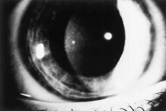 Arcus lipoides is a circular lipid infiltration of the peripheral stroma of the cornea, separated from the limbus anteriorly by a distinct, clear zone. It is formed by the junction of two arcs commencing first above and then inferiorly. The lesion is granular and is made up of two wedge-shaped opacities based on Descemet's and Bowman's membranes and extending into the stroma. The outer edge is better defined than the inner edge.115 Arcus senilis is an opacity of the peripheral cornea occurring in middle-aged or older persons (Fig. 12). Pathologically, it is characterized by a hyaline sudanophilia of Descemet's and Bowman's membranes and a granular sudanophilia of the corneal stroma.122 The chemical composition of senile arcus appears to be chiefly cholesterol ester with some cholesterol and a neutral glyceride, with the density of the opacity related to the concentration of sterol ester deposited.123 Arcus in elderly persons is generally not related to disturbed metabolism. Arcus juveniles corneae may be associated with extensive lipochemical alteration in the serum of young persons.124 The presence of arcus in a young patient requires investigation into the possibility of a lipoprotein or lipid metabolism disorder. A higher prevalence of arcus has been reported in the black population, especially in young blacks, in the absence of elevated cholesterol.125 Other ocular lesions associated with hypercholesterolemia include tuberous xanthomas of the lids and conjunctival, retinal, and choroidal deposits.126 Turgidity of the plasma is associated with hypertriglyceridemia, which may be noted in the plasma or serum. This lactescence is identified in the retinal vessels as lipemia retinalis.115 Lipemia of the limbal vessels also has been seen. With longstanding hypertriglyceridemia, all arteries and veins, including those at the disc, are cream-colored and show a broadened light reflex in the fundus.126 Twenty-six patients with hyperlipidemia (serum cholesterol or triglyceride > 95th percentile for age) were compared with normal individuals for the presence of arteriovenous nicking, “sclerosis,” narrowing, and tortuosity. No differences were found in the retinal arterioles of patients with hyperlipidemia compared with the control group.127 Thus, examining the retinal arterioles is not helpful in detecting hyperlipidemia. Eruptive xanthomas may be seen on the lids and, less commonly, on the iris and in the retina.126 MANAGEMENT. Treatment includes prevention and management of complications through lifestyle alterations, such as dieting and exercising, and through drug therapy. There are three types of cholesterol-lowering drugs: bile acid-binding resins, niacin, and HMG-CoA reductase inhibitors. For hypertrygliceridemia, niacin and gemfibrozil are available. When a combination of these therapies is inadequate, apheresis can be performed every 7 to 14 days.128 Whether a decrease in serum lipid levels causes a regression of xanthomas is controversial. Familial Lecithin:Cholesterol Acyltransferase (LCAT) Deficiency In this rare metabolic disorder, absence of the enzyme that transforms fatty acid from lecithin to cholesterol results in abnormally high serum levels of free cholesterol and lecithin.115,129–130 The plasma may be turbid or milky. Erythrocyte lipid composition is abnormal, with target cell formation, anemia, and reduced erythrocyte life span. Phagocytosis of excess lipid results in sea-blue histiocytes in the bone marrow and spleen.131 Premature atherosclerosis may develop atherosclerosis, as well as renal failure secondary to lipid deposition in glomeruli. The disorder is inherited as an autosomal-recessive trait.130 The LCAT gene is situated on chromosome 16 in close proximity to the α-haptoglobulin locus.132 The gene defect is not geographically restricted to Scandinavia, as has been previously reported.133–134 Corneal opacification, the single obligatory clinical sign of LCAT deficiency, has been noted in all homozygous cases reported in the literature.135 In contrast, anemia was present at the time of diagnosis in 92% of the reviewed cases, and proteinuria was present in 76% of cases. OCULAR FINDINGS. Corneal opacities, which are present in all patients from early childhood, are diagnostic. Numerous small, fine gray dots are distributed throughout the stroma, causing diffuse haze without affecting the visual acuity. The epithelium, endothelium, and Descemet's membrane are spared. Near the limbus, the dots become more numerous, forming a gray, circular band resembling arcus senilis. The lipoid arcus is nearly always present. A relatively clear zone separates the circular band from the limbus in most patients. The outer border of the arcus is irregular because of differences in the number of stromal dots. In addition to the pathognomonic diffuse cloudiness in the corneal stroma, and the peripheral arcus lipoides, anterior and posterior crocodile shagreen have been described.136 Whether the two conditions are related is not known; however, the deposition of material in LCAT deficiency may alter the arrangement of collagen lamellae. DIAGNOSIS. LCAT activity can be measured in plasma. Total cholesterol is variable: there is increased unesterified cholesterol and markedly decreased esterified cholesterol. VLDL is elevated. Because the general signs and symptoms of LCAT deficiency are nonspecific (anemia, proteinuria) and the biochemical changes cannot be detected by routine laboratory tests, the ophthalmologist is in a key position to recognize the disease based on findings from a routine slit lamp examination. DIFFERENTIAL DIAGNOSIS. The ringlike condensation in the periphery differs from typical arcus lipoides in its indistinct, irregular, blurred margin and a limbal zone of mild opacities containing vacuoles. Both share a clear zone between the peripheral opacity and the limbus. An arcus lipoides in young people is called anterior gerontoxon, or arcus juvenilis. It may accompa