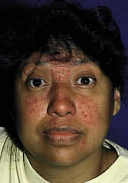 Ichthyosis This group of skin disorders is characterized by extremely dry skin and accumulation of desquamated cells. There are multiple forms, but the less rare are ichthyosis vulgaris, X-linked ichthyosis, congenital ichthyosiform erythroderma, epidermolytic hyperkeratosis, and lamellar ichthyosis.266 Scaly lesions of the skin with brittle nails, decreased sweating, and sparse hair characterize these disorders. Ectropion, blepharitis, and conjunctival hyperemia are frequent. Exposure keratopathy can occur related to the previously mentioned changes, but primary involvement of the cornea also can be present.267 Pre-Descemet's membrane opacities, punctate epithelial keratopathy, pannus, stromal neovascularization, and prominent corneal nerves have been reported. Ocular lubricants should be used as needed. Psoriasis Scaly skin lesions on the face, neck, and extremities typify psoriasis. The disease is associated with HLA CW6 and HLA DR7.268 Ocular manifestations are present in 10% of the patients269 and include cicatricial ectropion, blepharitis, and conjunctivitis. The cornea may have immune complex deposits at the limbus, peripheral vascularization and scarring, and peripheral ulceration. Treatment of psoriasis with long wavelength ultraviolet light and psoralen can lead to a superficial punctate keratitis. |