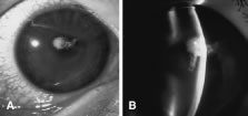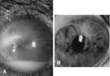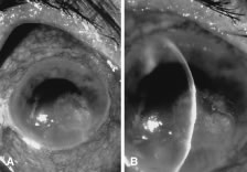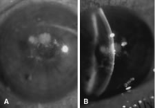 Keratitis caused by Nocardia, nontuberculous Mycobacterium, and other low-virulence bacteria resembles filamentous fungal keratitis by the presence of intact epithelium, multiple stromal infiltrates, and minimal inflammation in the adjacent stroma. Candida infection typically produces epithelial ulceration, focal necrotizing stromal inflammation, moderate cellular infiltrate and edema in the adjacent stroma, and mild or moderate iritis in the early stages, indistinguishable from bacterial keratitis (Figs. 15, 16, and 17). Fungal elements cannot be detected by biomicroscopy. If untreated, the keratitis evolves to produce dense suppuration and necrosis of the deep stroma. Although multifocal suppuration may develop in polymicrobial keratitis, there is no distinctive sign of mixed Candida and bacterial infection (Fig. 18).