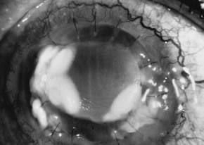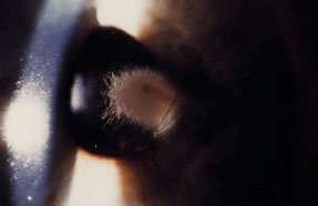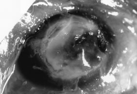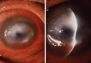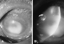 Advanced, severe filamentous fungal or yeast keratitis is indistinguishable from keratitis caused by virulent bacteria such as Staphylococcus aureus or Pseudomonas aeruginosa. The area of epithelial and stromal ulceration is large. Dense, opaque, homogenous, yellow-white stromal necrosis develop and is surrounded by confluent cellular infiltrate and full-thickness stromal edema (Figs. 19, 20, 21). Hyphal elements may penetrate Descemet's membrane and endothelium and be visualized in the anterior chamber. Fibrinous material accumulates over the endothelium, anterior chamber angle, and iris. Pain is typically severe. Secondary ocular hypertension may ensue. Progressive stromal necrosis leads to corneal perforation and, rarely, consecutive endophthalmitis.