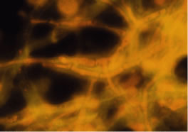 Calcofluor white is a fabric whitener used in the textile industry. The material absorbs ultraviolet light at 340 to 400 nm and emits a blue light. Calcofluor white has an affinity for cellulose and chitin, which are common compounds of hyphal fragments and yeasts.37,38 The preferred procedure is to fix the smear in 95% methanol for 5 to 10 minutes, apply calcofluor white stain (number 17353)* to the surface of the slide, apply a coverslip over the slide, drain excessive fluid with an absorbent towel, and examine by fluorescent microscopy. Depending on the selection of filters, fungal elements stain apple green to steel gray against a rust or red background (Fig. 23). *Polysciences, Warrington, PA.