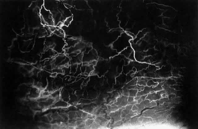 The characteristic features of necrotizing scleritis on fluorescein angiography are hypoperfusion and, eventually, nonperfusion of the vascular networks (Figs. 40 through 43).26 The initial changes are on the venous side of the capillary network; the transit time of the dye increases even if the eye is red and congested. If the disease process persists or has been present for a long time, thrombosis and permanent vaso-occlusive changes occur. These vessels (or the occluded capillary network) are bypassed by the opening of anastomotic channels. New vessels in a granuloma give rise to deep intrascleral leakage of dye (see Fig. 43). Conjunctival and episcleral involvement by the destructive change is late but is always preceded by vaso-occlusive changes that can sometimes be detected with use of the red-free light on the slit lamp (Figs. 44 and 45).