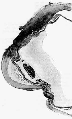What is clinically represented solely by inflammation and edema is histopathologically a granulomatous lesion of the sclera, the center of which consists largely of plasma cells, lymphocytes, and mast cells (Figs. 21 through 23). Foster and colleagues have identified the cellular subsets and glycoproteins in both necrotizing and non-necrotizing scleritis.22 This shows an active T-cell inflammatory response with a high CD4/CD8 ratio and increased HLA/DR and CD14, indicating a macrophage-induced response that would lead to granuloma formation. Remote from the granuloma, the fibrocytes of the sclera become activated, the proteoglycan adjacent to them becomes altered, and the collagen fibrils of the sclera become unraveled (Figs. 23 and 24). These changes appear to take place prior to the invasion of the stroma by cells of the granuloma.20 The vessels in and around the necrotic area show medial necrosis and perivascular cuffing with lymphocytes, and endothelial swelling with microvascular occlusion. Ninety-six percent of the specimens examined by Foster and associates show a microangiopathy characterized by a neutrophil infiltrate in and around the vessel wall.22–23 This is most obvious at the center of the lesion where there may be occlusion of the vessel, thrombosis, or even aneurysm formation (Fig. 25). From these pathologic investigations, clinical observations, animal experiments, and the results of fluorescein angiography, it would appear that the scleral inflammation is initiated either by trauma (be it accidental or surgical)23–25 or by bacterial or viral infection. If circulating immune complexes are present because of the poor blood flow, they become precipitated in and around the vessel walls in the area of inflammation. In other patients, a persistence of tissue damage will lead to autoimmunization. Damage to the endothelial cells of the microvasculature leads to changes within the vessels detectable on angiography and to catabolic changes in the surrounding tissues. These changes, in turn, allow the granulomatous response that is seen in histopathologic sections, the first detectable change being in the scleral fibrocytes and the proteoglycan and collagen remote from the site of cellular infiltration.