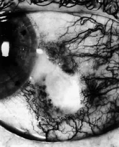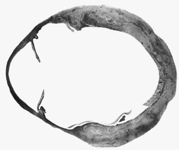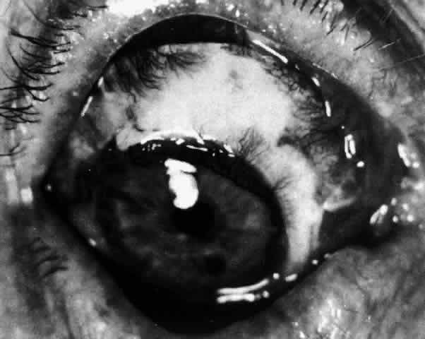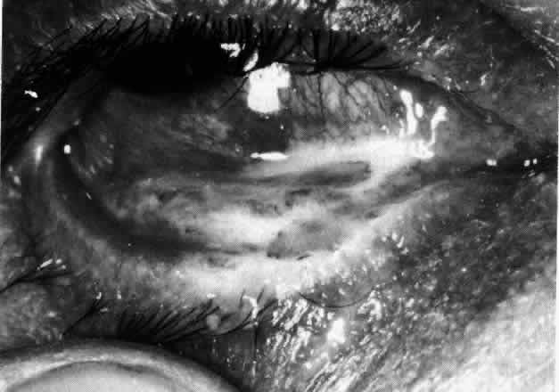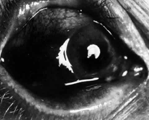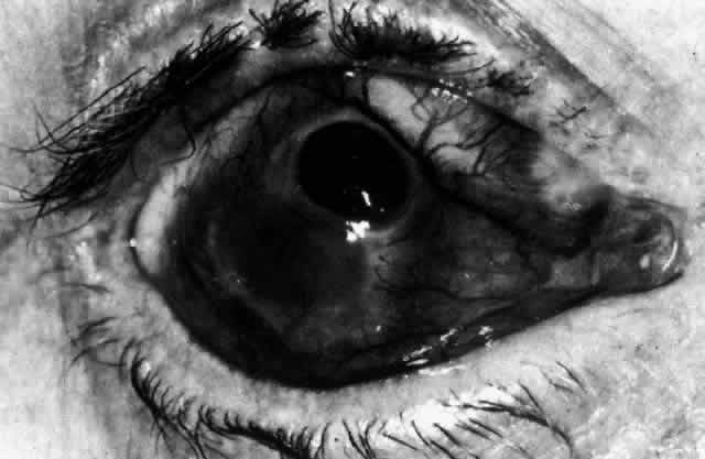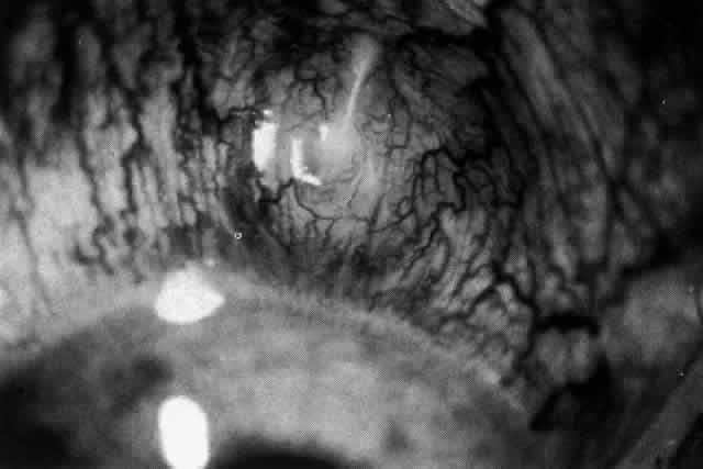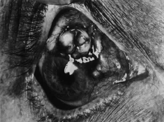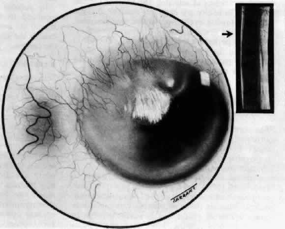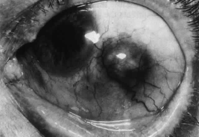 the laceration. All detachment surgeons have reason to know how poorly sclera heals; wounds often open years after surgery or open easily when surgery is repeated. Traumatic wounds, therefore, require careful and exact apposition, reposing or excising uveal tissue between the scleral edges. If strong chemicals, whether acid or alkali, come into direct contact with the sclera, they may destroy the collagen, leading to death of the tissue (Fig. 78). However, the scleral tissue rarely sequestrates but remains to form a matrix on which the fibrous scar forms. Being freely permeable, the underlying choroid is subject to more damage, and the overlying episclera may be totally destroyed. If the exposed sclera is covered by viable conjunctiva or mucous membrane, the sclera may retain sufficient integrity for some scar formation to occur. It is impossible to suture into the friable tissue, and the graft must be anchored elsewhere. Severely damaged sclera can be removed and replaced by donor tissue, which again acts as a matrix for scar tissue. However, an eye so severely damaged as to require this procedure usually becomes phthisical.