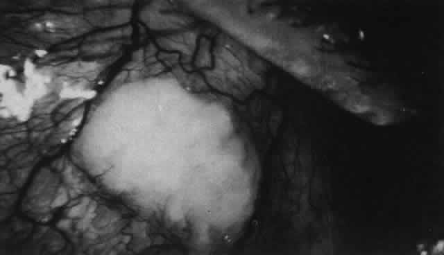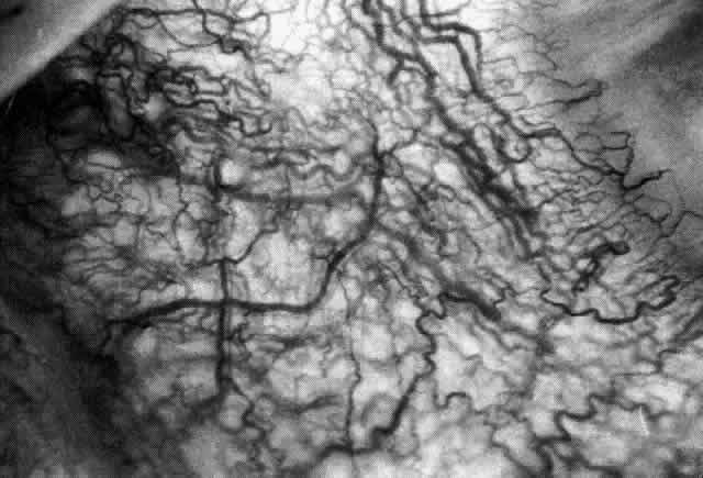 In the early stages of the vascular tumors, all that can be seen is a dilatation of some of the vessels of the deep episcleral network (Fig. 87). In some congenital varieties, these anomalies can be extensive, but, as in the skin hemangiomas, they regress with age. However, from time to time, angiomas arise within the episclera; they resemble an amelanotic melanoma and sometimes cannot be distinguished except by biopsy (Fig. 88). Here again, the new vessels that form in the tumor itself and in response to its presence appear to radiate from the mass rather than skirt it, as in the inflammatory conditions.