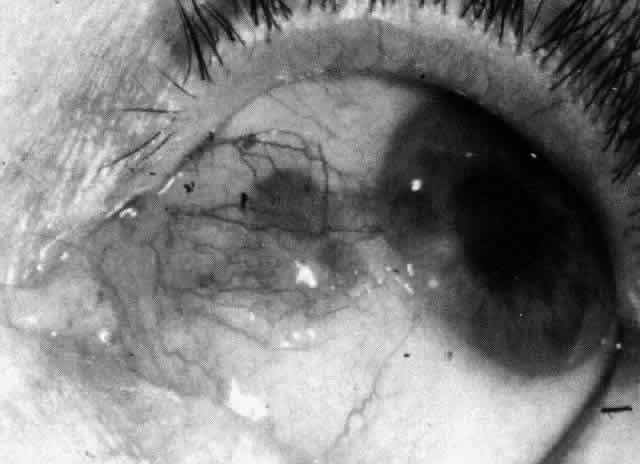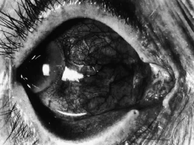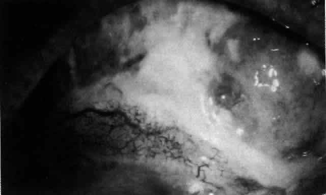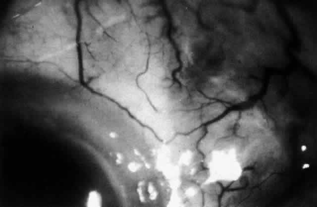 a tumor is suspected. The sclera forms a barrier for the spread of intraocular tumors, but the vascular and nervous intrascleral canals form a channel through which tumor cells can extend into the episcleral tissues. In certain instances, particularly in intraocular malignant melanomas, myelomas, and sarcoidosis, a vascular response is excited in the deep episcleral tissues with dilatation, tortuosity, and newly formed vessels (see Fig. 77). Deposits in episcleral tissue and tumors that arise from episclera often cause difficulty in diagnosis. The localized epithelial tumors, such as the intraepithelial epithelioma (Bowen's disease), present little difficulty because the deep tissues are rarely involved and the tumor ulcerates onto the surface (Fig. 84). The pigmented tumors also do not cause any great difficulty in diagnosis, but occasionally a nonpigmented nevus of the episclera of conjunctiva occurs. In the initial stages, these form a diffuse infiltrated lesion of the episclera usually very close to the limbus. As time passes, new vessels pass to the lesion, which may remain the same size or grow slowly (Fig. 85). Should malignant change occur within the lesion, the surrounding tissues will become inflamed and the feeding vessels greatly enlarged (Fig. 86). In necrotizing nodular scleritis, the large vessels adjacent to the inflammation enlarge but do not pass into the lesion itself, so the engorged vessels appear to skirt the nodule (see Figs. 27 and 28).
