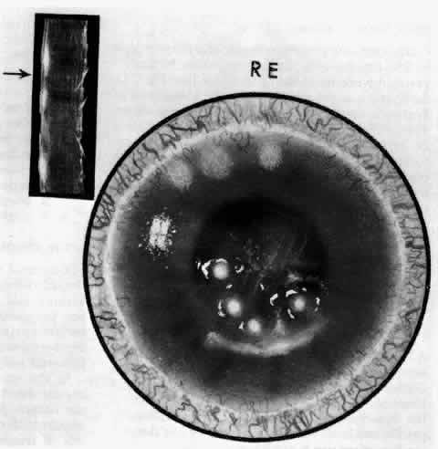 ACUTE STROMAL KERATITIS The corneal signs may arise simultaneously with the scleritis or occur later in the disease. An acute keratitis will often produce a limbal flush, which has occasionally been confused with a scleral inflammation. In lupus erythematosus, the corneal lesions may appear first, to be followed within 2 to 3 days by a diffuse scleritis. In the acute stage of the disease, the vision rapidly deteriorates because of a diffuse clouding of the cornea. Superficial and midstromal opacities appear both centrally and around the limbus (Fig. 68). If treatment is not instituted at this stage, vascularization will follow and the opacities will become permanent. However, if treatment is successful, the edema and the opacities can disappear completely. In nodular scleritis, the corneal changes are localized to the area of the inflammation, and should the condition recur, the opacity returns in exactly the same area, often extending farther into the cornea (Color Plate 1F). SCLEROSING KERATITIS Sclerosing keratitis is the most common corneal complication of scleral disease. Depending on the type of scleritis, the corneal changes may be diffuse, annular, or localized. The first change is a diffuse striate appearance affecting the full depth of the cornea that becomes slightly thickened and appears gray. These changes move toward the center of the cornea with surprising speed unless the condition is vigorously treated. Behind the advancing edge, spotty white opacities may develop in the cornea that may become “crystalline” in appearance, looking much like floss candy (Fig. 69). Occasionally, “precipitin rings” may appear around the white corneal opacities. Vascularization, when it occurs, appears to be entirely passive. The vessels show no active budding and follow a long way behind the advancing edge. The vascularization is usually superficial but can occur at any level. The cornea may become quite white and look like porcelain, but there remains a comparatively clear zone near the limbus. In recurrent nodular scleritis, the changes remain localized to one area. The change in the corneal stroma results in defective nutrition, so that, if the condition persists, lipid becomes deposited adjacent to the outer edge of the lesion, leaving a yellow opacity in the midstroma (Fig. 70). LIMBAL GUTTERING Limbal guttering may follow active scleral disease but is not characteristic of scleritis, and when guttering occurs without scleral inflammation in long-standing rheumatoid arthritis, the cornea looks as if it is covered by a corneal contact lens; the center is much thicker than the periphery. When limbal guttering follows a scleritis, lipid deposition is the rule. Occasionally, a Terrien-like ulcer can appear at the site of a prolonged scleritis, or the deep corneal layers may break, causing aqueous leakage into or through the cornea (see Figs. 65 and 66). When there is a severe vascular shutdown at the limbus or a severe necrotizing disease of this region, peripheral ulcerative lesions very similar to those seen in Mooren's ulceration may develop. These ulcers are infiltrated and swollen on the central margin, and there is also a marked infiltration at the advancing edge of the peripheral ulcer. The ulcer may be sloping or undermined. The epithelium almost always remains intact, and the base may be vascularized. The limbal arcades adjacent to the advancing edge are disrupted, and the new vessels that arise from the limbal arcades leak into corneal tissue. KERATOLYSIS Keratolysis occurs in very severe necrotizing disease or scleromalacia perforans in which the superficial layers of the previously clear cornea melt away, sometimes over areas of several millimeters (Figs. 71 through 74). In very severe cases, descemetoceles form, and although spontaneous rupture is unusual, the cornea is so thin that it can easily be ruptured by minor trauma, in which case the eye may well be lost (see Fig. 73). Treatment is urgent. If medical treatment can be instituted at once, the process will stop and some repair of the cornea will result (see Fig. 74). However, once descemetocele formation has occurred, surgery is the only treatment. Lamellar keratoplasty retains the integrity of the host endothelium and is effective for removing the necrotic tissue. Although multiple grafts may be required, this procedure is the most effective method of controlling the condition. Graft sutures will not hold unless the accompanying scleritis is adequately controlled; therefore, systemic therapy should not be discontinued at the time of surgery.
