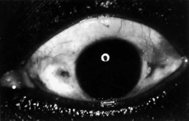 Infection around implants used in detachment surgery and stitch abscesses following squint and other scleral surgery are not uncommon, and it is surprising how rarely complications follow. As soon as the offending irritant has been removed, the sclera readily heals without apparent tissue defect. If the irritation is prolonged, a progressive necrotizing scleritis can result. Scleritis from this cause is very persistent and very difficult to treat. Endogenous PYOGENIC. Endogenous pyogenic infections are a rarity, presumably because of the poor blood supply of the sclera. The sclera is so resistant to the pyogenic infection inside the eye that the contents can be eviscerated in patients with panophthalmitis, leaving no infected areas. When, however, a pyogenic infection does affect the anterior sclera, a discharging abscess forms, accompanied by severe intraocular inflammation and occasionally hypopyon. Infection of the posterior sclera is far more difficult to diagnose. The inflammation and pain are intense, the vision invariably reduced, and the eye proptosed, sometimes giving the impression of an orbital tumor. However, very frequently the patient is feverish, the preauricular gland is enlarged and tender, and the lids are swollen. This is a situation that is never found in granulomatous posterior scleritis. Early diagnosis is essential if effective treatment is to be instituted. Provided any abscess is opened and the appropriate antibiotic is given, the results are good. Patients with scleral abscesses that have perforated the wall of the globe with loss of some of the intraocular contents have been known to recover full vision.34 Other organisms known to cause scleral abscesses are Pseudomonas aeruginosa, the streptococci, and Proteus. Fungal infections with Aspergillus in particular are not uncommon, and Acanthamoeba can invade the sclera in a severe infection. In all these instances there is difficulty in deciding whether this is a localized abscess or a severe noninfective scleritis because it is rare for there to be any purulent discharge. It is important to know that infections of the sclera can and do occur. SPECIFIC GRANULOMATOUS CONDITIONS. Whereas pyogenic infections are uncommon, the nonpyogenic granulomatous conditions are common enough to be looked for routinely, particularly because their presentation is no different from that of nonspecific granulomatous scleritis. Although there may be other signs of these infections in the uveal tract, this is by no means universal. Both syphilis and tuberculosis can present with a scleritis. None of the patients we have seen have had any other ocular signs or general symptoms (Fig. 81). The patients with syphilis presented with a diffuse anterior scleritis, and those with tuberculosis presented with a nodular scleritis (see Fig. 34). Caseation is unusual, but perforation is said to occur.35,36 Treatment is with the appropriate chemotherapy and antibiotic, followed by an intensive local steroid regimen to suppress the local inflammatory response.