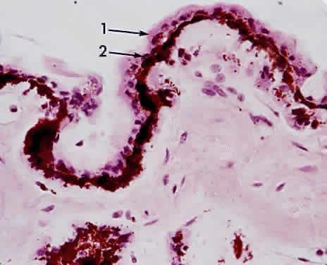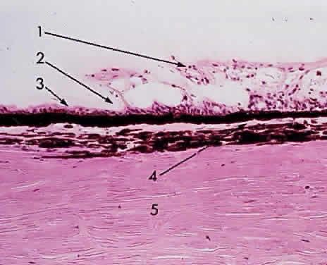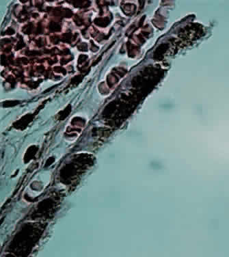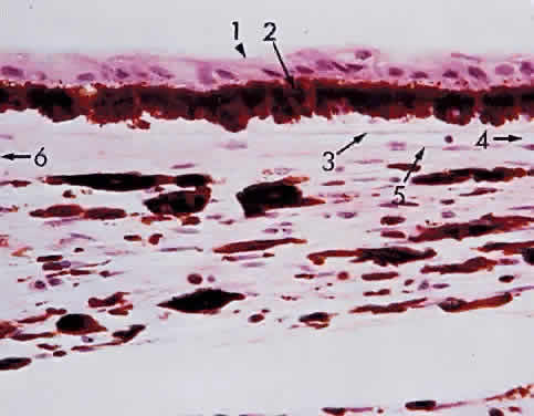 MICROSCOPIC FEATURES The iris forms the posterior boundary of the anterior chamber angle (Fig. 4). The thin iris root is continuous with the pectinate ligaments of the trabecular meshwork. The surface of the anterior iris is irregular, with furrows and crypts. The pupillary zone is located between the collarette and the pupillary ruff. The remainder of the iris is called the ciliary zone. The fringed iris collarette is located approximately 2 mm from the pupillary border. The major arterial circle is located in the ciliary body, to which the thin iris base is attached (Fig. 5). Blunt trauma to the globe often tears the iris at its thin base (iridodialysis), and hemorrhage leaks into the anterior chamber (hyphema). The major arterial circle is formed by the junction of the long posterior ciliary arteries and the anterior ciliary arteries extending from the insertions of the extraocular rectus muscles. Two anterior ciliary artery branches extend from each rectus muscle scleral insertion at the level of the ora serrata, except for the lateral rectus muscle, which sends only one branch. Therefore, during extraocular muscle surgery, care should be taken not to sever more than three rectus muscles during one operation to avoid anterior segment ischemia. Tributaries from the major circle are sent radially to the lesser arterial circle at the iris collarette (Fig. 6). The iris crypts are tiny caverns located between the vascular radiations, and they lead into the stroma. The iris contraction furrows are concentric with the periphery of the ciliary zone. They become prominent when the pupil dilates, thus permitting the telescoping effect during mydriasis. Although the iris has no definite anterior endothelial membrane, an irregular arrangement of stroma is condensed to form the anterior border layer. The iris stroma features pigment cells and clump cells interspersed between the blood vessels. The walls of the blood vessels are relatively thick, so that dilation or contraction of the pupil does not impair blood flow. The tight endothelial cell attachments may explain the relatively low permeability of normal iris vessels during angiography. The blood vessels are masked by the stromal pigment in brown irides but are often easily seen by biomicroscopy in blue irides. The sphincter muscle of the iris is a circular band of interwoven fibers surrounding the pupil (Fig. 7). It is innervated by the ciliary nerves (parasympathetic nerve fibers). The sphincter muscle is so constructed that even if part of the sphincter is cut or excised, the remaining fibers can still contract or relax. The dilator muscle of the iris is a long, thin band of radially arranged fibers lying just anterior to the pigmented epithelium (Fig. 8). The dilator fibers have cell bodies that are small and round, with long cytoplasmic extensions stretching out anteriorly. The fibers of the dilator muscles of the iris are innervated by the sympathetic nervous system, and stimulation causes mydriasis. The cell bodies of the dilator muscles are cuboidal, heavily pigmented, and closely adherent apex to apex to the cells of the posterior layer of iris pigmented epithelium. The pigmented epithelium of the iris is a lamina of heavily pigmented columnar cells; it lines the posterior surface from the pupillary ruff to the ciliary body. The pigmentation of this layer is so dense that the cell nucleus usually cannot be seen unless the microscopic sections of the iris are cut very thin or bleached (Fig. 9).