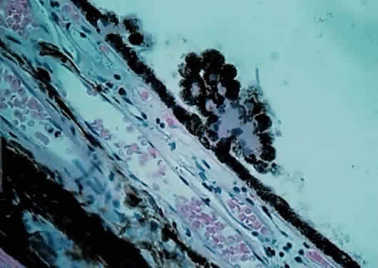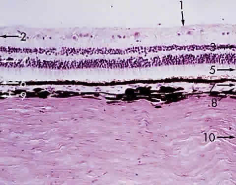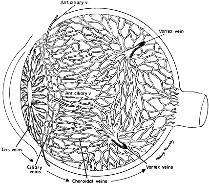 during photocoagulation of neovascular membranes. During angiography, fluorescein dye is carried to the choriocapillaris from the larger vessels. Because the choriocapillaris leaks fluorescein easily, the dye diffuses rapidly throughout the choroid but cannot pass anteriorly into the retina because of the tight junctions between the RPE cells. Thus, clinically during an early phase of angiography, a shaded diffuse glow of fluorescein appears in the choroid as a result of the opaque RPE. If defects occur in the RPE (e.g., drusen, serous detachment), fluorescein can leak into the retina from the choroid. With the increasing incidence of age-related macular retinal degeneration, more attention is being directed to the subfoveal choroidal anatomy and changes in disease. Photodynamic therapy with verteporfin IV dye and laser treatment may help to prevent visual loss secondary to subfoveal choroidal neovascularization. New research into medication to inhibit vascular endothelial growth factor offers potential treatment for the future. The retinal vessels, in contrast to the choroidal vessels, do not leak fluorescein normally. At the optic disc, the choroidal vessels also leak fluorescein, so the perimeter of the disc “lights up” in the late phase of angiography even though the disc vessels proper do not normally leak fluorescein. The primary function of the choroid is to supply nutrition to the rod and cone layer of the retina. Because of the erectile potential of the vascular channels, the choroid may also have a role in regulating intraocular pressure and in acting as a heat diffuser to protect the photoreceptors from the heating effect of absorbed light, particularly at the macula. At the optic disc, the choroidal circulation joins with the short posterior ciliary vessels and the branches from the central retinal artery to supply nutrition to the optic nerve. As a feature of glaucoma, choroidal peripapillary atrophy is a frequent hallmark. Embryologically, the choroid is derived from the mesoderm that surrounds the posterior portion of the primitive cup. The choroidal bond of Bruch's membrane to the pigmented epithelium of the retina is strong, so in “true” retinal detachments the line of cleavage is between the rod and cone layer and the pigmented epithelium. MACROSCOPIC FEATURES Grossly, the choroid represents a vascular bed formed by the junction of the anterior and posterior ciliary arteries (Fig. 16). The ciliary arteries (2 long posterior arteries, 20 short posterior arteries, and posterior communications of the anterior ciliary arteries) pierce the sclera to reach the choroid. They divide into vessels of gradually smaller caliber and end as choriocapillaris, nestled adjacent to Bruch's membrane. Thus, the choroid is an expandable vascular plexus that supplies nutrition for the rod and cone layer of the retina and up to 130 mm of the outer retina, particularly the macula. Thus, choroidal vascular changes due to inflammation or degeneration lead eventually to retinal pathology (e.g., subretinal neovascularization). The venous drainage from the choroid is through the four vortex veins, one in each quadrant of the posterior sclera (Fig. 17). In choroidal detachment, the vortex veins still adhere to the sclera, inducing loculations or grapelike mounds of fluid compartments in the edematous choroid. MICROSCOPIC FEATURES The choroid may be classified in layers, from the external to the internal surface. The suprachoroid is the space between the inner pigmented sclera (lamina fusca) and the large vessels of the choroid. The large-vessel layer (Haller's layer) is the outermost layer of the choroid. It is characterized by wide-caliber veins and arteries. Many melanocytes and ciliary nerve fibers are scattered throughout the vessel layers. The melanocytes and the Schwann cells encasing the nerve fibers, along with an occasional cluster of nevus cells, may be the precursors of the dreaded malignant melanoma of the choroid. The medium-vessel layer (Sattler's layer) is composed of medium-sized blood vessels and is located in the center of the choroid. The choriocapillaris is a layer of very large fenestrated capillaries (40 to 60 μm in diameter) lying in a single plane external to Bruch's membrane (Fig. 18; no fenestration of the choriocapillaris is visible at this level of magnification). The capillary lumina are large enough to pass several red blood cells simultaneously (Fig. 19). Unlike the larger vessels in the choroid, the fenestrated choriocapillaris lacks an internal elastic lamina and therefore leaks fluorescein during clinical angiography. Pericytes are found on the outer wall of the capillaries. Postmortem injection studies suggest that the choriocapillaris is continuous, but the choriocapillaris functions clinically like an end arteriole network. At the posterior pole, the choriocapillaris has a lobular pattern with a central precapillary arteriole and a peripheral postcapillary venule.