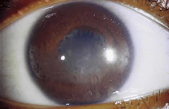 The iris often becomes atrophic in patients with chronic iridocyclitis. Atrophy of the posterior pigmented epithelium of the iris is more common in herpetic uveitis and may result in iris transillumination defects (Fig. 10). Anterior stromal atrophy is more characteristic of Fuchs' iridocyclitis and often results in heterochromia. The irides should therefore be examined by external inspection with the room lights on to document any heterochromia and at the slit lamp to document transillumination defects.