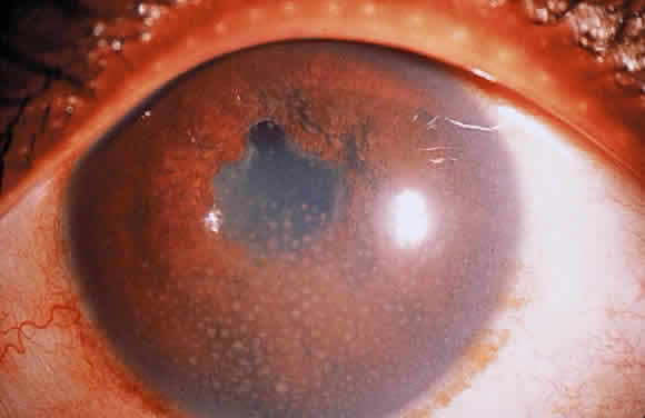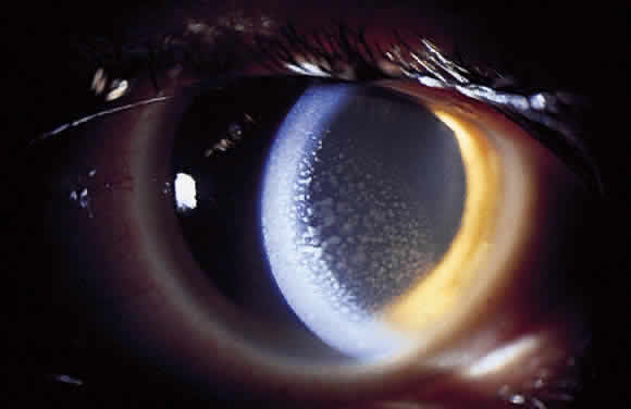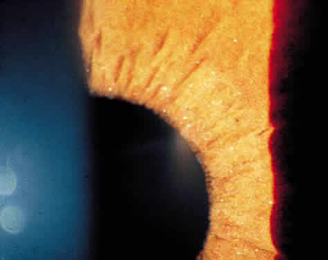 CILIARY INJECTION Ciliary injection, or “ciliary flush,” is manifest by a ring of dilated episcleral vessels radiating from the limbus. It should be distinguished from the deeper and more peripheral injection of scleritis and from the sectoral or diffuse injection of episcleritis. Overlying conjunctival injection may mask ciliary flush but topically applied neosynephrine blanches the overlying conjunctiva, allowing visualization of deeper episcleral vessels. PUPILLARY MIOSIS OR IRREGULARITY The pupil is typically small in patients with iritis because iris inflammation results in a release of prostaglandins, which constrict the pupil.4 One exception is patients with herpetic uveitis, who may present with a dilated pupil.5 The pupil in patients with anterior uveitis often becomes irregular and fixed because of the development of posterior synechiae. BAND KERATOPATHY Long-standing chronic iridocyclitis, especially in children, may result in calcific band keratopathy, the deposition of calcium hydroxyapatite in the cornea at the level of Bowman's membrane. Band keratopathy usually begins as grayish-white opacities at the periphery of the interpalpebral region. The opacification may spread centrally and in time may form a complete band within the interpalpebral zone. A lucid interval is noted between the band and the limbus because Bowman's layer does not extend to the absolute limbus.6 Small clear areas are noted in the opacity, representing the location where corneal nerves penetrate Bowman's layer. These holes impart a “Swiss cheese” appearance to band keratopathy (Fig. 1). Band keratopathy should be distinguished from Vogt's limbal girdle and spheroidal degeneration. Occasionally, band keratopathy is atypical and starts centrally. Rarely, it forms a reticular pattern resembling lattice dystrophy called superficial reticular degeneration of Koby.7 KERATIC PRECIPITATES Clusters of inflammatory cells deposited on the endothelial surface of the cornea are known as keratic precipitates. The cells, which have been deposited from the aqueous humor, are often found inferiorly on the cornea in a linear vertical formation (Turk's line) or in the form of a base-down triangle (Arlt's triangle; Fig. 2). The inferior corneal distribution results from convection currents in the anterior chamber that rise along the warm iris and fall along the cool cornea. Exceptions to the rule of inferior distribution of keratic precipitates include inflammation secondary to herpes simplex and zoster, cytomegalovirus, and Fuchs' heterochromic iridocyclitis, which result in fine stellate keratic precipitates, often throughout the whole cornea. Sarcoidosis and VKH may also result in keratic precipitates distributed above the midline but these keratic precipitates tend to be larger and greasier in appearance than those associated with Fuchs' or herpetic iridocyclitis.