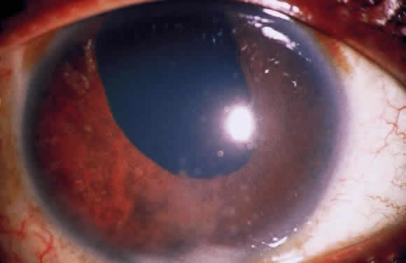 Posterior synechiae may also develop without nodule formation because fibrin in the aqueous can induce adhesions to the lens. Later, fibrous organization may make adhesions pharmacologically unbreakable, and the formation of synechiae during treatment indicates inadequate therapy. If posterior synechia formation proceeds unchecked, pupillary block glaucoma may develop (Fig. 8). Peripheral anterior synechiae (PAS) in the anterior chamber angle may result from chronic shallowing of the anterior chamber because of posterior synechiae and pupillary block. They may also result from fibrous organization of inflammatory exudates and precipitates in the angle. Rubeosis may also occur in severe long-standing uveitis and lead to PAS. Progression of PAS may lead to angleclosure glaucoma.