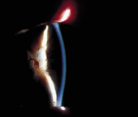 In cases of chronic iritis, tiny refractile crystals may be seen on the surface of the iris, probably representing Russell bodies16,17 (Fig. 9). The iris of patients with chronic iritis may demonstrate prominent iris vessels that follow the normal anatomy. These congested normal vessels must be distinguished from neovascular rubeotic vessels, which tend to arborize at random. Clinically, it may sometimes be difficult differentiate the two, and both types of vessels leak on fluorescein angiography.18