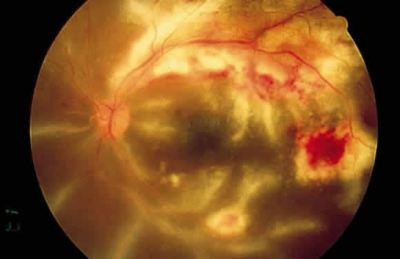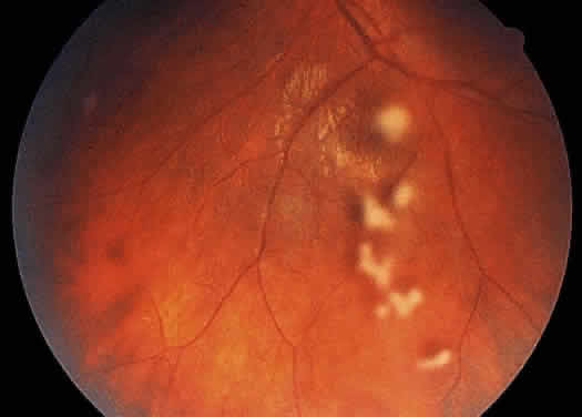 Posterior vitreous opacities are best studied with contact or noncontact (78 diopter, 90 diopter, or superfield lens) slit-lamp biomicroscopy. Exudates or clumps of inflammatory cells may be seen anywhere in the vitreous. They may line the posterior surface of a posterior vitreous detachment, forming so-called vitreous precipitates, which are analogous to keratic precipitates and are common in toxoplasmosis. They may also be seen within the vitreous or on the retinal surface. Large clumps of vitreous cells are often termed “snowballs” (Fig. 11). Traction bands may form in the vitreous and result in the development of vitreous hemorrhage or retinal detachment.