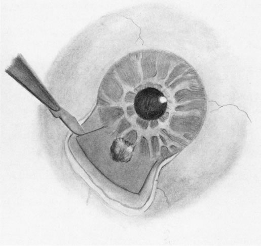 an excisional biopsy for lesions that are small and localized. INDICATIONS FOR IRIDOCYCLECTOMY Mass Lesion Growth The option of observing a ciliary body lesion is determined by its initial status on presentation. Small lesions may be followed for growth if visual functions are intact; however, most melanomas43 and medulloepitheliomas44 result in early enucleation because of advanced stages at presentation with cataract, glaucoma, retinal detachment, and sometimes pain. Small lesions confined to the iris and ciliary body may be successfully resected, usually when they produce symptoms or documented suspicious growth. Ciliary body melanoma often remains hidden and asymptomatic until attaining a large size, which may obstruct the visual axis or produce glaucoma. Vail33 noted that iridocyclectomy may be performed with lesions not greater than 4 clock hours, although other authors have stated that lesions from 2.5 to 6 clock hours can be safely excised.20,33,45,46 Intraoperative and postoperative complications, particularly hypotony, are increased proportionally by the size of the tumor. Whether enucleation would result in better survival statistics than iridocyclectomy in larger melanomas is not known. Complications include seeding of the iris by iris melanoma and tumor recurrence.47,48 Thorough systemic and ocular examination should reveal no evidence of tumor extension or metastases prior to excision. TECHNIQUE OF IRIDOCYCLECTOMY Limbal Flap Approach A fornix-based conjunctival flap is made to expose sclera in the area of the tumor. An anterior-hinged limbal-scleral flap is raised four-fifths of the scleral thickness at least 3 mm around the tumor (Fig. 2). Diathermy is applied to the remaining scleral bed surrounding the tumor. The anterior chamber is entered, and the flap is elevated to expose iris and tumor (Fig. 3). The tumor is excised starting at the pupil margin, moving posteriorly, and removing the section in one piece. The sector iridectomy is then closed with fine nonresorbable suture and the scleral flap is closed with interrupted sutures (Fig. 4).