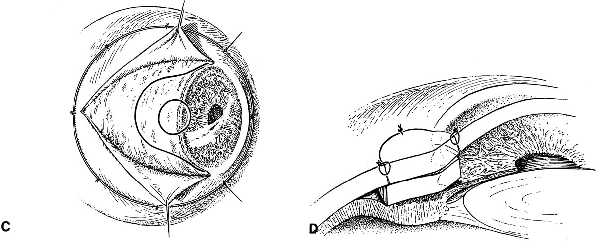 T Incision of Stallard The T incision of Stallard allows larger tumor exposure and excision. A conjunctival flap is opened to expose bare sclera and a Flieringa ring is fixed through episcleral sutures. A T-shaped limbal-scleral incision is then made with a knife and extended with the corneoscleral scissors. Closing sutures may be preplaced. The ciliary body surrounding the lesion is treated with penetrating diathermy (Fig. 5A). With the cornea and scleral flaps reflected, the pupillary margin is grasped and the iris incised radially to the iris root (Fig. 5B). The involved portion is excised with scissors.49,50 Modifications of this technique, such as eliminating the Flieringa ring or including cataract removal, may be made as necessary. Müller45 described a technique using a trephine to replace the overlying corneoscleral tissue over the tumor prior to dissecting the sclera (Fig. 5C). Its advantage is that there is less likelihood of disturbing the tumor mass while excising the tumor (Fig. 5D). Iridocyclochoroidectomy of Peyman Iridocyclochoroidectomy of Peyman allows large tumor removal when there is more choroidal involvement posteriorly. After transillumination, localization, and marking on the bare sclera, a Peyman C-shaped cyclectomy basket is sutured in place (Fig. 6A). The scleral flap is fashioned depending on the location of the tumor. A limbal-based scleral flap can be raised with tumors located anteriorly not involving the retina. However, with more posteriorly located tumors that involve the retina, the scleral flap is started at the limbus and dissected posteriorly. A partial-thickness scleral flap is dissected and penetrating diathermy performed around the tumor margins outlined by transillumination (Fig. 6B). The tumor is excised with scissors, using radial iris incisions extending along the diathermy margins (Fig. 6C). The crystalline lens is removed with vitrectomy instruments, cutting all zonular attachments. After suturing the sclera in place with fine nonresorbing sutures (Fig. 6D), a vitrectomy is completed through an opening in the wound, or preferably using a standard pars plana approach. Ocular volume is replaced by intravitreal gas or silicone oil injection. Endolaser retinopexy is used to augment diathermy more posteriorly around the tumor base to ensure chorioretinal adhesion.
