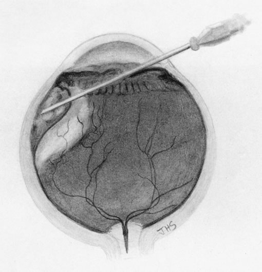 techniques and the use of biopsy techniques. FINE-NEEDLE ASPIRATION BIOPSY Ophthalmic fine-needle aspiration biopsy has developed along with the evolution of radioactive plaque therapy and more conservative surgical approaches to enucleation. Cytopathologists have achieved definitive diagnoses based on small cellular samples.54,55 The method of choice for fine-needle aspiration biopsy is contingent on the existing anatomic state of the eye, the location of the tumor, size of the tumor, and presence of retinal detachment. The anterior uveal lesion may be approached through the cornea-limbus for iris lesions (Fig. 7), or in aphakic eyes, into the more posterior ciliary body lesions (Fig. 8). In the posterior uveal lesion, either a pars plana transvitreal approach may be made (Fig. 9) or a transscleral approach may be adapted in more anterior lesions or in lesions with overlying retinal detachment (Fig. 10). Most surgeons prefer to use a 25-gauge fine needle with a flexible connector to a 10-mL aspiration syringe to minimize movement and surgical trauma during biopsy (Fig. 11). Some surgeons prefer a spinal tap needle with a trocar and cannula56; however, many surgeons use a standard long 25-gauge needle. It is felt that the excess movement caused by removing the trocar and attaching a syringe and flexible connector may lead to increased complications.
