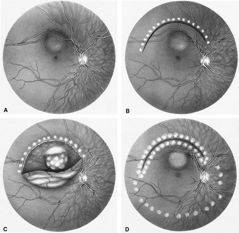 Full-Thickness Eye Wall Resection of Peyman Preoperatively, the mass lesion is surrounded by rows of heavy photocoagulation, which is performed in two sessions 3 to 4 weeks apart.69–75 The resection is performed 4 weeks after the final session.73 A conjunctival 360-degree peritomy is carried out, and the tumor is localized by transillumination and diathermy. A Peyman basket is sutured to the globe. A partial-thickness scleral flap is dissected around the lesion. Penetrating diathermy is applied around the tumor in the scleral bed. A pars plana sclerotomy is performed for later vitrectomy and sealed with scleral plugs or temporally sutured (Fig. 13A). The tumor is excised with curved Vannas scissors (Fig. l3B). After the scleral flap has been sutured in place (Fig. 13C), a pars plana vitrectomy is performed to remove any vitreous blood and incarcerated vitreous from the excision site (Fig. 13D). Surgery is performed under hypotensive anesthesia to reduce the risk of hemorrhage.72