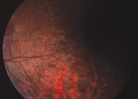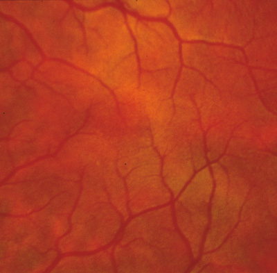 The ocular manifestations of patients with albinism vary in severity among the different types of this heterogeneous group of conditions but share characteristic common features.31 Sensory nystagmus is present very early in life but improves in amplitude and frequency with increasing age. This is frequently the presenting sign of the disorder. In most cases the nystagmus is pendular and horizontal. Occasionally a null region and compensatory face turn may be present. A detailed discussion of eye-movement abnormalities in patients with albinism is beyond the scope of this review. Reduced visual acuity is present from birth, and ranges from 20/40 to 20/400 in most cases. Vision usually remains stable, but may improve slightly with age in some patients. Poor binocular vision and reduced stereopsis may be present; however, many patients can pass parts of the clinical stereo tests.32 Iris color ranges from light blue with a pink reflex in OCA1A to hazel in other types, and may change as more pigment is deposited with age. Iris transillumination is best detected by means of the slit-lamp and retroillumination in undilated patients. In some cases the outline of the lens can be seen through the iris (Fig. 4). Hypopigmentation of the iris pigment epithelium results in light scatter and contributes to the subjective complaint of photophobia in some (but certainly not all) patients. Fundus hypopigmentation is also variable. A dilated-fundus examination may reveal a prominent choroidal vascular pattern resulting from decreased or absent RPE melanin (Fig. 5). The optic nerve head may be grayish in patients with OCA1A, or it may be hypoplastic (Fig. 6). Absent macular xanthophyll pigment and a diminished foveal reflex indicate foveal hypoplasia (Fig. 7).33,34 The latter is considered one of the main factors underlying reduced visual acuity in albinism. Abnormal macular vascular patterns may be present in which retinal vessels course through the foveal avascular zone instead of arching around it, which is a hallmark of foveal hypoplasia.35 Whether foveal hypoplasia in albinos is directly related to reduced macular RPE melanin is unknown. Optic nerve hypoplasia is a well documented but not very common finding in albinos.36 Megalocornea, aniridia, posterior embryotoxon, Axenfeld's anomaly, glaucoma,37,38 retinal coloboma, and abortive cryptophthalmos have also been reported in rare individual patients, and except for mild anterior segment dysgenesis are probably coincidental.