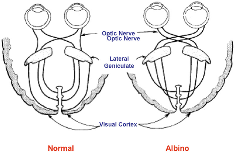 All albino mammals have abnormalities of visual system development. Three
