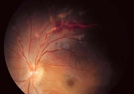 EALES' DISEASE Eales' disease was initially described as recurrent retinal and vitreal hemorrhages, epistaxis, constipation, and headaches in young men.34 It has since been redefined as an idiopathic obliterative peripheral retinovasculopathy with variable degrees of nonperfusion, vascular sheathing, retinal vascular abnormalities, peripheral retinal neovascularization, and hemorrhage (Fig. 6).35 It usually affects men in the third decade of life and is bilateral in up to 90% of cases.36 Many patients are symptomatic in only one eye, but fundus examination of the fellow eye may reveal early changes such as periphlebitis, vascular sheathing, and peripheral retinal nonperfusion.37 The presenting symptom in 90% of patients is a painless blurring of vision, often due to vitreous hemorrhage.36