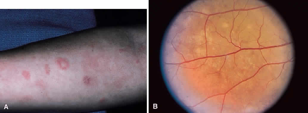BACTERIAL ENDOPHTHALMITIS Retinal periphlebitis has been described in early staphylococcal endophthalmitis and has been reproduced experimentally by intravitreal staphylococcal injections in monkeys.157 Retinal periphlebitis was found in 26 of 28 human autopsy eyes with bacterial endophthalmitis.158 Cotton-wool spots, retinal hemorrhages, and Roth spots (white-centered hemorrhages) were observed in septic patients without intraocular inflammation and may represent infectious embolization to the retinal circulation.159,160 TUBERCULOUS PERIPHLEBITIS Periphlebitis is considered the most common retinal manifestation of tuberculosis.161 It is usually associated with peripheral capillary closure that may lead to ischemia and new vessel formation.162 The diagnosis of tuberculosis-related retinal vasculitis is presumptive and can be controversial. It is usually based on the clinical picture with a positive tuberculin skin test.163 The exclusion of other possible causes and a favorable response to antituberculosis medications support the diagnosis.163 The pathogenesis of tuberculosis-related retinal vasculitis is still unclear, but two mechanisms have been suggested.162,164 One mechanism involves an infectious process, wherein the tuberculous bacilli are directly responsible for the observed lesions. This mechanism seems probable when tubercles are present in the choroid. The alternative hypothesis suggests that hypersensitivity mechanisms are responsible for retinal vasculitis.162,164 The relation of tuberculous periphlebitis and Eales' disease must be considered. SYPHILITIC UVEITIS Periphlebitis is mostly found in congenital syphilis and was the only vascular lesion in a case of acquired lues, mimicking a branch vein occlusion.165 Secondary syphilis can be accompanied by severe posterior uveitis. Retinal vasculitis usually accompanies syphilitic chorioretinitis.166,167 The vitreous may show a dense haze, and gray exudates may be seen in the posterior pole, along retinal vessels, and around the optic nerve head. Syphilis can also present as a necrotizing retinitis with marked sheathing of arteries and veins.168 Although uncommon, primary syphilitic vasculitis can occur, affecting both arteries and veins.169 It is associated with retinal and preretinal hemorrhages and neovascularization. RARE VIRAL INFECTIONS Rare viral infections associated with retinal vasculitis include influenza, infectious mononucleosis, and Rift Valley fever, which is an arthropod-borne viral infection of sheep and cattle that is spread by an insect bite. Macular retinitis and vascular occlusions secondary to proliferation of viral particles in vascular endothelial cells have been reported.170 TOXOPLASMOSIS Ocular toxoplasmosis typically causes a necrotizing retinitis with a reactive choroiditis. There may also be periphlebitis with or without venous obstruction, arteritis and arteriolar occlusions, retinal hemorrhages, and Roth spots.171–173 Yellow refractile deposits (segmental periarteritis) along the arteries in the posterior pole have been described.30,31,174 These plaques are numerous during the active stage of chorioretinitis and resolve as the inflammation subsides. The plaques do not obstruct blood flow and are on the outside of vessels. Diffuse perivenous sheathing has been observed in the vicinity of, as well as distant from, the chorioretinitis. UNCOMMON PARASITIC INFECTIONS Rickettsia, the causative agent of Rocky Mountain spotted fever, are obligate intracellular parasites with a preference for vascular endothelium.175 They primarily affect small arterioles, causing vessel wall necrosis, thrombosis, and hemorrhage. Ophthalmoscopic features of rickettsial infection include artery and vein occlusions with a clinical picture similar to Eales' disease. Babesiosis is a rare tickborne intraerythrocytic parasitic disease similar to malaria. It is characterized by fever, lymphadenopathy, arthralgias, and hemolytic anemia. Splenectomized patients, elderly persons, and immunocompromised and HIV-infected patients are especially predisposed to infection with babesiosis.176 A case of babesiosis mimicking lupus retinopathy has been reported.177 It is believed that the cotton-wool spots observed were caused by immune complex-mediated retinal arteriolitis. Hemorrhagic vasculitis with perivascular eosinophilic and plasma cell infiltrates has been observed in experimental onchocerciasis.178 Onchocerciasis-related eye disease is an important cause of blindness, especially in the forest-savanna mosaic areas of Nigeria.179 The onchocercarial-induced lesions that are responsible for visual impairment and blindness are chorioretinitis and optic nerve disease.179 Giardia lamblia, an intestinal parasite, has also been associated with iridocyclitis, vitritis, and patchy retinal arteritis.180 ACQUIRED IMMUNE DEFICIENCY SYNDROME Retinal microvasculopathy, the most common ocular manifestation of HIV infection, occurs in up to 70% of patients.181 The most common clinical presentation of retinal microvasculopathy is cotton-wool spots, reported in 26% to 53% of cases.182 Cotton-wool spots may be associated with other microvascular abnormalities, such as superficial or deep retinal hemorrhages, white-centered retinal hemorrhages (Roth spots), microaneurysms, and intraretinal microvascular abnormalities. Retinal microvasculopathy occurs with increasing frequency as the CD4 T-cell count decreases. The cause and pathogenesis of the microvasculopathy are uncertain, but it is likely that either direct infection of vascular endothelial cells by HIV, immune complex deposition in retinal arterioles, or both, are involved.182 Endothelin-1, a cytokine with a potent vasoconstriction activity, has also been considered to play a role in its pathogenesis.183 Coinfection with hepatitis C virus has also been proposed as a precipitating factor for the development of HIV microangiopathy.184 Periphlebitis has been reported in a few patients with HIV infection