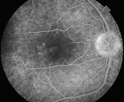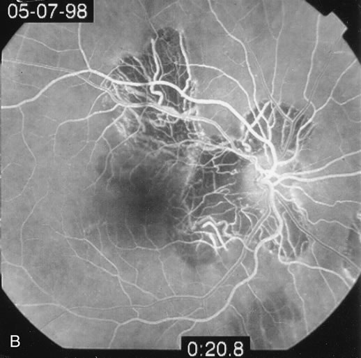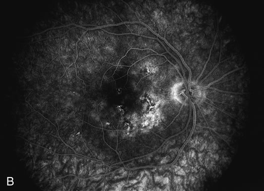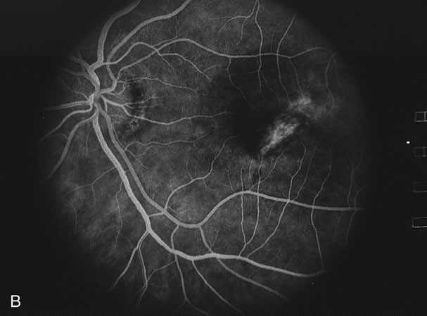 Usually there is resolution of the fundus findings, although careful fundus evaluation sometimes shows some residual fine retinal pigment epithelial mottling. In rare cases, there may be long-standing pigment clumping with surrounding pigment atrophy similar to the lesions seen in multifocal choroiditis or punctate inner choroidopathy although that has been contended. The foveal granularity may take longer to resolve than the white spots. There may be mild optic disc swelling. This may lead someone unfamiliar with this disease to consider that the cause of visual loss is optic neuritis. There also may be mild retinal phlebitis that may be more easily seen by fluorescein angiography than by ophthalmoscopy. Choroidal neovascularization rarely develops.9 ANCILLARY TESTING Fluorescein The fluorescein angiograms of the white dots show a fine halo appearance in a wreath-like swirl configuration to some of the white dots, and this halo diffuses in the later stages of the angiogram, first developing a stippled pattern of fluorescence and then becoming a diffuse white spot that leaks only mildly. There may be leakage of fluorescein from the optic nerve and occasionally, there may be late staining of retinal vessels because of a mild vasculitis (Figs. 3 and 4).