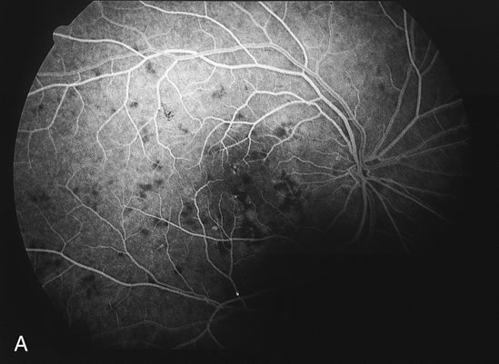 Fluorescein angiography may show hyperfluorescent spots that increase slightly in the later phases in active lesions. In inactive lesions, these spots become window defects. If there is a choroidal neovascular membrane it is usually seen at the edge of the scar and tends to have classic features. ICG angiography shows hypofluorescent lesions some of which cannot be seen by fundoscopy or by fluorescein angiography. In addition, there may be hypofluorescence surrounding the optic disc in cases of enlarged blind spots in conjunction with multifocal choroiditis.42 ASSOCIATIONS Tubulointersitial nephritis and uveitis are more common among young women. Uveitis usually occurs a few months after the development of the systemic findings that include proteinuria, fever, fatigue, weight loss, and abdominal pain. Although the uveitis is often an anterior uveitis, there has been a case of multifocal choroiditis associated with tublointerstitial nephritis.43 There have been a few cases of multifocal choroiditis associated with West Nile disease (William F. Mieler, personal communication). In addition, the Epstein-Barr virus has been associated with a few cases of multifocal choroiditis.44,45 Familial juvenile systemic granulomatosis is characterized by granulomatous polyarthritis, granulomtous uveitis, and a rash.46-48 It is an autosomal dominant disorder linked to chromosome 16. Many of these patients have been noted to have an anterior uveitis, which may be granulomatous or not and a posterior uveitis that presents as multifocal choroiditis and they also have a vitreitis. The fundus findings are similar to those seen in sarcoidosis or in multifocal choroiditis and panuveitis. TREATMENT OF MULTIFOCAL CHOROIDITIS Treatment is rarely required to prevent the development of choroiditic lesions. If it is necessary, corticosteroids have been used but it is still controversial whether they prevent the development of new lesions. More often treatment is required because of the development of choroidal neovascular membranes or cystoid macular edema. Approximately one third of the eyes tend to develop choroidal neovascularization at the edges of a choroidal lesion.40 If the membranes are extrafoveal, laser photocoagulation is the best treatment. For subfoveal choroidal neovascular membranes or juxtafoveal choroidal neovascular membranes that are within 50 μm from the center, the best method of treatment is still controversial. Photodynamic therapy can be considered as well as surgical excision. Sometimes the choroidal neovascular membranes may respond to periocular subtenon's corticosteroid injections or systemic corticosteroids. Consideration of adjunctive intraocular corticosteroid injections with photodynamic therapy has not been reported but may be a reasonable consideration in this disease. Cystoid macular edema may be a cause of marked visual loss in patients with multifocal choroiditis. Approximately 10% may lose vision worse than or equal to 20/200 because of cystoid macular edema.40 Periocular corticosteroid or systemic corticosteroids may be helpful. In addition, some cases respond to systemic methotrexate. Intraocular corticosteroids may also be considered. |