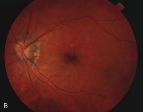 HISTORY AND CLASSIC FINDINGS Presumed ocular histoplasmosis (POH) is probably caused by dissemination of the histoplasma capsulotum after acute exposure to the organism. It is characterized by punched-out chorioretinal lesions, peripapillary scarring, and choroidal neovascular membranes, with no vitreous or anterior chamber inflammation. This disease is seen most often in people who come from the Ohio-Mississippi River Valley area where the fungus is ubiquitously found. Most often patients present in their fourth and fifth decade of life because of the development of a choroidal neovascular membrane. There may be a genetic predisposition and patients that have the HLA-B7 or the HLA-DR2 haplotype may be more susceptible to developing the ocular form of the disease. It is hypothesized that after acute exposure to the organisms by inhalation in susceptible persons, there may be a pulmonary infection associated with symptoms of a lower respiratory tract infection including mild fever and a cough. This elicits a granulomatous response and the organisms are probably destroyed by this cell-mediated response. As opposed to the inflammatory choroiditides, POH tends to be asymptomatic unless there is a choroidal neovascular membrane that is causing visual symptoms. There have been a few cases reported that appear to show that there can be symptomatic exacerbations of the inflammatory component of the choroidal scars. These cases are rare and they appear to respond to corticosteroids. There are also rare cases of intrascar neovascularization that may imitate the exacerbation of inflammation. It is hard to distinguish intrascar neovascularization from a true exacerbation of inflammation because they both show subretinal fluid, the patient is symptomatic in both, and the lesions respond to corticosteroids many times in both cases or at least temporarily in cases of intrascar neovascularization. If there is subretinal hemorrhage, the cause of the symptoms is neovascularization. Once the neovascularization extends to the edge of the scar, then laser photocoagulation or photodynamic therapy should be considered. These intrascar neovascularizations are different from classic cases where the neovascularization begins at the edge of the scar.39 BIOMICROSCOPY Rarely, there are some cases of documented choroiditis associated with histoplasmosis. There are however rare cases and if there is choroiditis, other diagnoses, especially multifocal choroiditis, should be considered. |