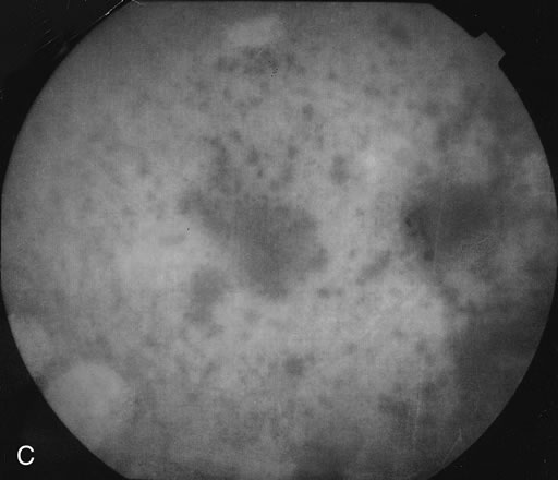 HISTORY AND CLASSIC FINDINGS In 1980, Ryan and Maumenee78 presented 13 cases (9 women and 4 men) with a mean age of 50.3 years and a range of 35 to 67 years. They complained of visual loss and floaters. Almost all had symmetric eye disease with mild to moderate visual loss, no inflammation in the anterior chamber, retinal vasculitis, cystoid macular edema, optic disc swelling, and depigmented diffuse pale chorioretinal spots that appeared to radiate out from the disc.78 Subsequently Gass78a described similar findings in a group of patients but termed the disease vitiliginous choroiditis. Probably the best follow-up study of patients diagnosed with birdshot retinochoroiditis to date shows that there is slow progressive visual field loss and subsequent vision loss as well.79 EPIDEMIOLOGY Most patients are in their fifth to seventh decade of life at the time of presentation. In the study by Oh et al.,79 the mean age at presentation was 45 years. The majority of patients are Caucasian and females are affected slightly more often than men. PATHOPHYSIOLOGY There is speculation that there is granulomatous infiltration of the choroid although the pathology is not completely known.80 The one part of the pathophysiology that is well known is the strong association with the HLA-A29 haplotype suggests that there is an immunogenic predisposition and that these patients may develop an autoimmune reaction to the retina or retinal pigment epithelium. There may be a ligand on the HLA-A29 protein that binds retinal soluble protein (retinal S-antigen) and this may be the autoantigen that triggers this autoimmune reaction in patients with the HLA-A29 haplotype.81 INITIAL CLINICAL FINDINGS Presenting Symptoms The patients usually present with complaints of decreased vision or floaters. Some patients may have paracentral scotomas, nyctalopia, and photopsias. Although there may be some asymmetry, the usual patient has symmetric involvement in both eyes. SIGNS Vision Although the vision may be normal at initial presentation, it may decrease to the 20/70 level. This disease is a chronic disease with acute exacerbations and the vision may thus fluctuate. Visual loss is usually because of cystoid macular edema although sometimes it may also be caused by spots under the fovea. It is a slowly progressive and relentless disease.82 In the study by Oh and colleagues,79 the mean initial visual acuity was 20/25 and the mean final visual acuity with a mean follow-up time of 82.5 months was 20/35. Pupils and Fields The study by Oh et al.79 showed a steady decrease in the size of the I4e isopter. There are fluctuations between each study so careful evaluation to compare the initial and final studies is essential. Biomicroscopy Many cases have vitreous cells and occasionally there may be cataracts although it is difficult because of the age of the patients to determine if the cataract is secondary to the inflammation or age-related. Fundus Findings In the acute phase, the most common finding is the multiple creamy ovoid yellow-white patches that radiate out from the optic disc and are approximately one half to three fourths disc diameter in size and with indistinct borders. With time these lesions may atrophy and coalesce causing large areas of chorioretinal atrophy. There may be cystoid macular edema and retinal vasculitis as well. Some cases may also develop choroidal neovascularization, epiretinal membranes, macular holes or cataracts (Fig. 19).