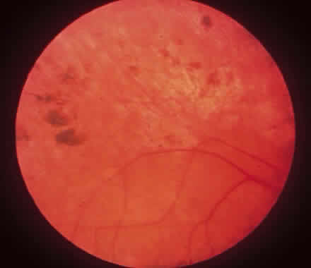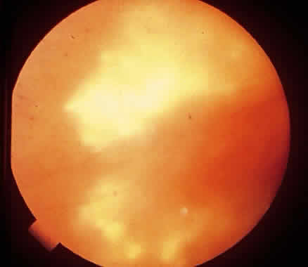 ranges from 0.8% to 4.3%.16,17 Syphilis is an increasing cause of new uveitis in the elderly.18 There are no pathognomonic features of syphilitic uveitis. Iridocyclitis in early disease may be unilateral and severe. In late tertiary syphilis, iridocyclitis may also be unilateral and appear 4 to 6 months after inadequate treatment of tertiary syphilis. Syphilitic chorioretinitis also has no pathognomonic features. There may be multifocal chorioretinal infiltrates, overlying vitritis, and papillitis.19 Early findings include vitritis (Fig. 1), multifocal chorioretinitis (Fig. 2), optic neuritis, retinal vasculitis, retinal hemorrhages, and retinal edema. Pigment proliferation is present late in the course of the disease (Fig. 3). Presenting complaints in patients with acute syphilitic uveitis include blurred vision, pain, redness, photophobia, and floating spots. Ocular involvement may be unilateral or bilateral, and acute or chronic. Syphilitic uveitis may be described as a panuveitis, but frequently the anatomic terms iritis, iridocyclitis, vitritis, chorioretinitis, and retinal vasculitis are appropriate, depending on which part of the eye appears to be involved primarily. The differential diagnosis of syphilitic uveitis when iritis is the primary presentation includes the HLA-B27 positive syndromes. When more posterior involvement is present, with vitreous cells and active retinitis, several entities must be considered (Table 2). History and laboratory studies are helpful in the differentiation. Cytomegalovirus infection may coexist with syphilitic infection in the patient with AIDS and must be considered as a cause of inflammation in any patient immunosuppressed for whatever reason. Syphilis is more rapidly progressive in HIV-infected patients.20 In these patients, dense vitritis may be the presenting ocular abnormality.21 Toxoplasmosis can be differentiated by the presence of a compatible lesion and a positive Toxoplasma titer. Candida endophthalmitis may coexist with syphilis in an intravenous drug abuser. Behçet's disease may be difficult to rule out clinically, especially when there is oral or genital ulceration, but HLA typing may be helpful. Sarcoidosis must be considered in any differential diagnosis of posterior uveitis, but it is less likely if levels of angiotensin converting enzyme and serum lysozyme and the chest radiograph are normal. Intraocular lym phoma (reticulum cell sarcoma) should be considered in the elderly patient with vitreous cell. Intraocular lymphoma may be diagnosed by cytologic examination of the vitreous. The problem is that syphilis may be present even when there are other causes of uveitis. If tests for syphilis are positive, the patient should be treated for syphilis, even when the patient has other likely sources of inflammation.