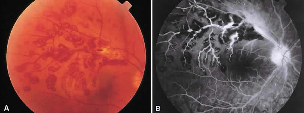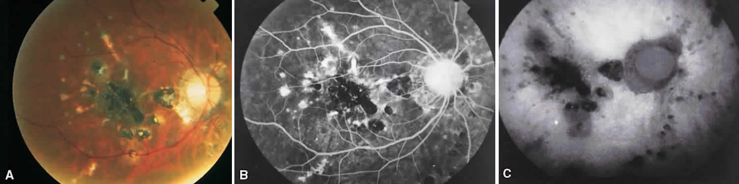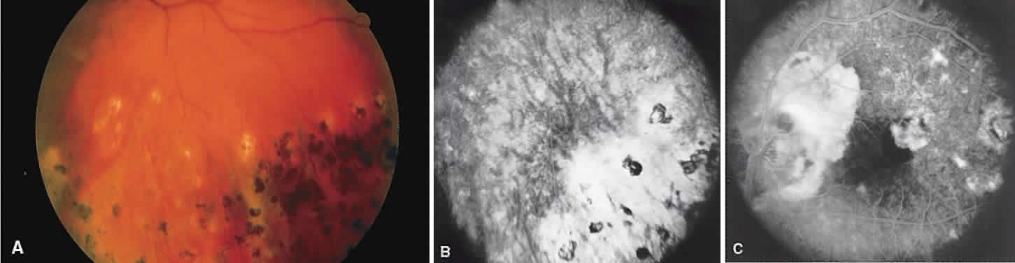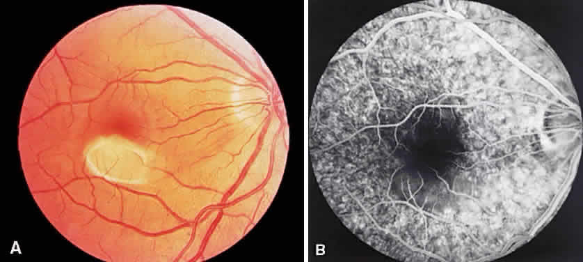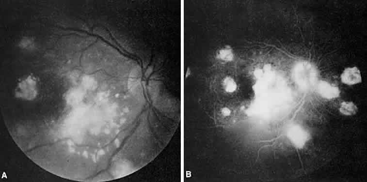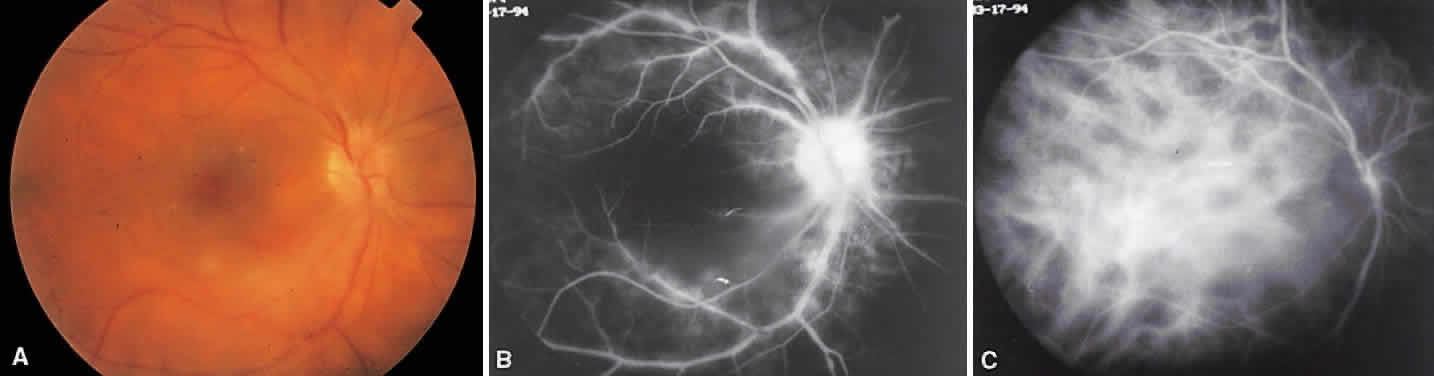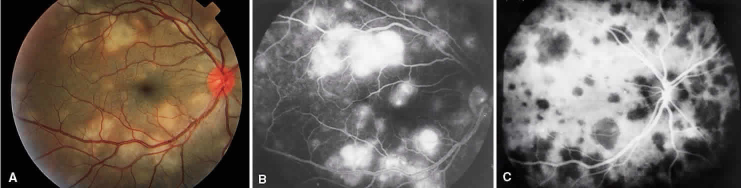 PRESUMED OCULAR HISTOPLASMOSIS SYNDROME Presumed ocular histoplasmosis syndrome consists of the following triad: peripapillary atrophy, “punched-out” chorioretinal lesions, and disciform macular scarring in young and middle-aged adults (Fig. 25A). If punched-out lesions (atrophic spots) occur in the macula, the probability of SRNV occurring within 3 years increases from 3% to 25%. A systemic histoplasmosis infection during childhood is believed to cause the syndrome. Fluorescein angiography is an important diagnostic test because SRNV is a major cause of vision loss (see Fig. 25B and C).82 The SRNV can be either peripapillary or macular. The choroidal neovascular membranes appear as a lacy network surrounded by a hypofluorescent ring in the early phase of angiography. A hallmark is the enlarging subretinalhyperfluorescence seen in the late venous phases. Punched-out lesions show early hypofluorescence followed by late scleral staining from the adjacent choriocapillaris,83 which can be differentiated from the progressively enlarging hyperfluorescence of SRNV. With ICG angiography, focal hyperfluorescent spots, which are more numerous than those seen on FA, are noted in the posterior pole during the intermediate or late phase of the study. These lesions are not detectable in most cases on funduscopic examination. Smaller hypofluorescent spots also are seen in some patients with this condition. They are similar to those observed in multifocal choroiditis. However, the larger hypofluorescent spots seen in multifocal choroiditis are not found in ocular histoplasmosis. This latter finding in ICG angiography allows the two conditions to be distinguished. If SRNV develops, localized areas of hyperfluorescence with late staining are seen. This observation helps to distinguish neovascularization from localized inflammation, with the latter showing persistent late hypofluorescence.84 CANDIDA ENDOPHTHALMITIS Candida endophthalmitis generally occurs in immunosuppressed patients and intravenous drug abusers. It also can occur in patients receiving hyperalimentation therapy and in patients after abdominal surgery. Candida endophthalmitis presents as white retinal abscesses with and without hemorrhage that extend into the vitreous and form vitreous snowballs (Fig. 26A). Roth's spots also can be seen. On fluorescein angiography, there are multiple early hypofluorescent deep retinal lesions that are not seen clinically. The white retinal lesions stain progressively in a centripetal fashion in the later phases (see Fig. 26B).85 |