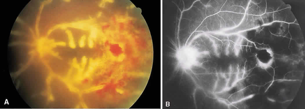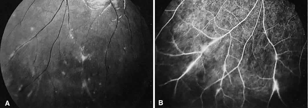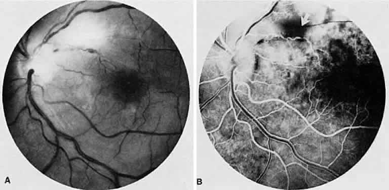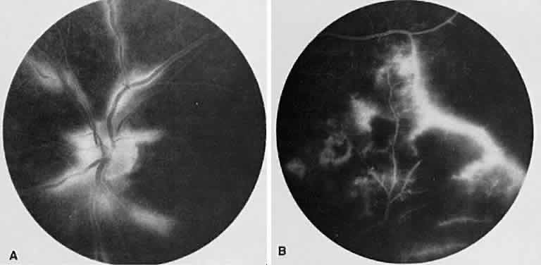 ACUTE RETINAL NECROSIS Acute retinal necrosis is an often bilateral peripheral retinitis that generally occurs in young, healthy adults. Herpes simplex, cytomegalovirus retinitis, and herpes zoster virus have been implicated as the etiologic agents in various patients. Acute retinal necrosis has a similar clinical appearance to proven cytomegalovirus retinitis. It presents as peripheral white necrotic retinal lesions, often with arteriolar occlusions and sheathing (Fig. 18A). Disc edema and pallor can be seen. Retinal detachments are frequent sequelae of the infection. Fluorescein angiography (see Fig. 18B) shows multiple retinal vascular occlusions, particularly arteriolar. In the late phases, the retinal vessels stain, often proximal to the occlusion. Nonoccluded vessels also may show staining.63,64 Late staining of the disc can be seen during the acute phase.64 The differential diagnosis includes herpes zoster retinitis, toxoplasmosis, and Behçet's disease. CYTOMEGALOVIRUS RETINITIS Cytomegalovirus retinitis often is found in immunosuppressed patients and in patients with acquired immunodeficiency syndrome. Clinically, it presents a sharply demarcated necrotizing hemorrhagic retinitis with a vasculitis that often is occlusive. The necrotizing retinitis usually is located in the midperiphery and clinically manifests as whitish opacifications in the deep retina and in the retinal pigment epithelium. Retinal hemorrhages are seen in the necrotic area and surrounding the leading edge (Fig. 19A). Retinal vascular sheathing, usually periphlebitis, may be bilateral or unilateral (Fig. 20).65 Retinal detachments (both exudative and rhegmatogenous) and vitreous cells can occur. On fluorescein angiography, findings that parallel the clinical appearance can be seen. Fusiform aneurysmal dilations of arteries, arteriole venules, and capillaries as well as capillary microaneurysms can be seen.66 The area of retinitis and necrosis blocks the choroidal fluorescence (see Fig. 19B); however, in the late venous phase, hyperfluorescence of the center lesion can be seen. Branch retinal artery occlusions may be seen.67 In addition, late dye leakage from arteries67 and optic disc occurs. ACQUIRED IMMUNODEFICIENCY SYNDROME Acquired immunodeficiency syndrome is caused by the human immunodeficiency virus. In addition to cytomegalovirus retinitis, the ocular complications of acquired immunodeficiency syndrome include Kaposi's sarcoma of the lids or conjunctive, Roth's spots, retinal hemorrhage, microaneurysms, telangiectasia, disc edema, cotton-wool spots, and cranial nerve palsies. On fluorescein angiography, microaneurysms, telangiectases, and small areas of capillary nonperfusion corresponding to the cotton-wool spots have been seen.68 HERPES ZOSTER Herpes zoster can cause an iridocyclitis with sector iris atrophy and retinal arteritis, retinal necrosis, and central retinal vein occlusion.69 Sector iris atrophy can be seen on iris fluorescein angiography.70 With arteritis, arteriolar narrowing and slow dye transit with fluorescein leakage are evident. SUBACUTE SCLEROSING PANENCEPHALITIS Subacute sclerosing panencephalitis is a progressive neurologic disorder that occurs in children and young adults. Measles virus is believed to be the infectious agent. Personality and behavioral changes occur and are followed by neurologic symptoms of seizures, dementia, coma, and death. Half the patients have visual involvement, which often antedates the neurologic symptoms. Clinically, a focal posterior pole retinitis and flat focal white retinal lesions are seen (Fig. 21). With fluorescein angiography during the acute stage, the lesions mask the choroidal fluorescence. There is late venous leakage, vein staining, and arteriole and venule occlusions.71 |