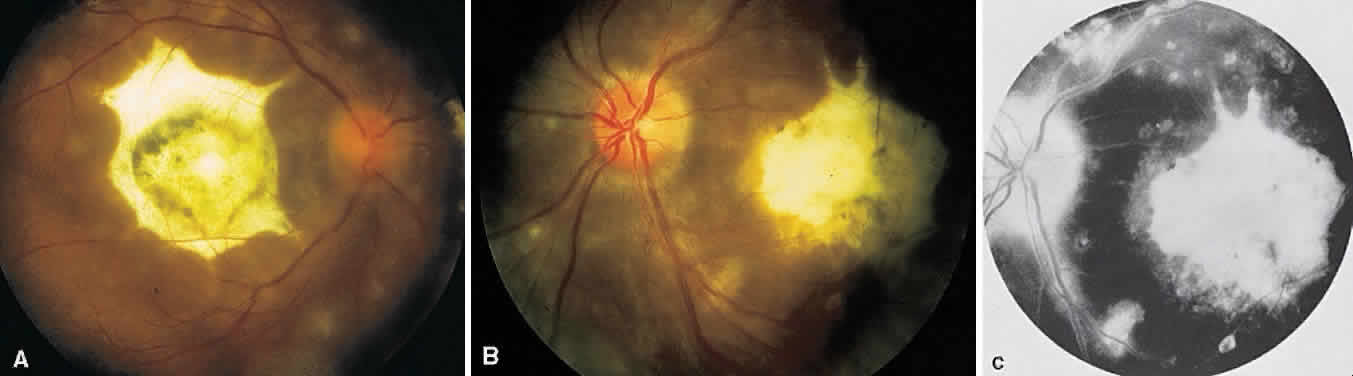 branch retinal artery occlusion also can be seen (Fig. 28A). A variant form of toxoplasmosis shows multiple gray-white deep retinal