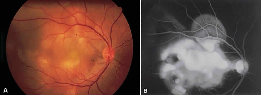 SYPHILIS Luetic chorioretinitis can present as a myriad of clinical findings, such as a salt-and-pepper fundus, cotton-wool spots, exudative retinal detachment, periarteritis, periphlebitis, disc edema, neovascularization, occlusive arteritis, multiple flat gray chorioretinal lesions, and macular edema. Ocular syphilis may mimic retinitis pigmentosa or acute retinal necrosis. Disciform scars are sequelae of macular choroidal inflammation. With cotton-wool spots and macular edema, capillary nonperfusion and diffuse leakage are seen, respectively, on fluorescein angiography. Patients with syphilis who have a retinitis pigmentosa-like fundus frequently show attenuated arterioles, delayed venular filling with late leakage of the peripapillary vessels, and mottled choroidal fluorescence.72 An edematous disc leaks dye.73 A fluorescein appearance similar to that of branch ret-inal vein obstruction can be seen.74 In rare cases, however, the FA in a patient with periarteritiscan be normal.75 Choroiditis can be seen as choroidal hyperfluorescence that resolves with treat-ment.72 SRNV presents with a typical appearance.76 Several cases of unilateral chorioretinitis presented as severe visual loss as the first manifestation of early secondary syphilis. Fluorescein angiography in these cases showed diffuse leakage under the neurosensory retina in the posterior pole associated with multifocal areas of staining along the retinal vessels (Fig. 22).77 A case of bilateral syphilitic posterior placoid chorioretinitis mimicking AMPPPE has been reported. ICG angiography showed hypofluorescent lesions during both early and late phases of the study, suggesting inflammation-associated perfusion abnormalities of the choriocapillaris.78 TUBERCULOSIS Tuberculosis has numerous ocular presentations, including anterior uveitis, scleritis, sclerokeratitis, phlyctenulosis, interstitial keratitis, choroidal granulomas (often with serous elevations; Fig. 23A),retinal exudate, macular star formation, retinal vas-culitis, vitreous cells, SRNV, and optic nerve granulomas. Eales' disease, a bilateral peripheral vasculitis with peripheral neovascularization and vitreous hemorrhage, frequently occurs in young men who have positive purified protein derivative test results (Fig. 24).