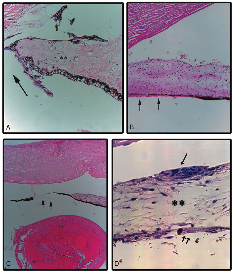 Pathologic changes in the iris and consequent clinical appearance may vary depending on the layer of the iris involved. Iris stromal atrophy causes stromal thinning and results in loss of iris crypts and the surface texture. Also accompanying degeneration or loss of stromal melanocytes might alter the color of the iris. Degenerative changes may include loss of normal iris stroma being replaced collagenous tissue that might appear whitish in color on slit lamp examination (Fig. 1A). Iris atrophy may be limited to the iris pigment epithelial layer (Fig. 1B). This may be seen in conditions such as pigmentary glaucoma,1 diabetic changes2 in the iris as well as chafing of the posterior iris surface after sulcus implantation of an intraocular lens3,4 (Fig. 1C). Such localized atrophy of the iris pigment epithelium would clinically show normal or slightly altered anterior iris and the presence of transillumination defects in the iris. Iris atrophy might also involve both stroma and the iris pigment epithelium where there might be focal or generalized loss of both layers giving a moth-eaten appearance to the iris or polycoria such as is seen in iridocorneal endothelial syndrome5 (Fig. 1D). |