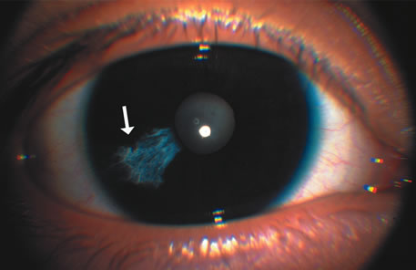 IRIDOSCHISIS Clinical Features Iridoschisis is a rare condition that involves the iris stroma. The term iridoschisis is used when there is a split causing a cleft to occur in the iris stroma. The iris pigment epithelium and dilator muscle posteriorly are unremarkable. Histopathology including transmission electron microscopy shows marked atrophy of the iris stroma with separation of its anterior and posterior layer. The iris vasculature appears unremarkable.6,7 Iridoschisis mainly occurs in elderly8–10 but isolated cases have been reported in young patients after concussive injury.11 It has also been reported to occur as a familial condition,12 has been associated with microphthalmos,13,14 interstitial keratitis,14,15 use of miotics,8 keratoconus,16 and lens subluxation.17 Slit-lamp examination reveals iris stromal fibers and blood vessels that remain attached to one portion of the iris with the loose ends floating freely in the anterior chamber, producing the so-called shredded-wheat appearance. The location of iridoschisis is often inferior (Fig. 3).