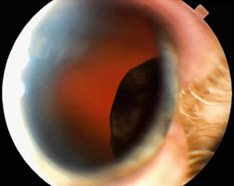 can be divided into congenital and acquired types.32–35 The most important congenital tumor of the nonpigmented ciliary epithelium is medulloepithelioma. Intraocular medulloepithelioma most often occurs unilaterally in young children in the first decade of life. It is an embryonic neoplasm that arises from the primitive medullary epithelium that is destined to form the nonpigmented ciliary epithelium in the adult. Cytological, it can be benign or malignant, but it rarely exhibits distant metastasis. Both the benign and malignant variants can occur as either a nonteratoid or a teratoid type. The nonteratoid type consists of a proliferation of fairly well-differentiated cells of the nonpigmented ciliary epithelium. The teratoid type contains heterologous elements, such as cartilage and skeletal muscle. In the early stages, medulloepithelioma appears as a gray-white tumor of the ciliary body (Fig. 23). As it slowly enlarges, it can cause a subluxation of the lens, secondary cataract, secondary glaucoma, retinal detachment and a white pupillary reflex (leukocoria) A characteristic feature is the development of clear cysts that are visible near the surface of the lesion. These cysts frequently break away from the main lesion and float freely in the vitreous or aqueous cavity. The main lesion continues to slowly enlarge and can eventually fill the entire globe and rarely extend through the sclera into the orbit. The management of intraocular medulloepithelioma is removal of the tumor by partial lamellar sclerouvectomy when it is small and circumscribed. However, there is tendency for recurrence, and enucleation may ultimately be necessary in many cases.34 The systemic prognosis is generally quite favorable. Acquired neoplasms can develop from the fully formed nonpigmented ciliary epithelium. Unlike the embryonic medulloepithelioma of childhood, acquired tumors of the nonpigmented ciliary epithelium do not contain teratoid elements. From a cytologic standpoint, they can be benign (adenoma) or malignant (adenocarcinoma). Even the malignant variant has little or no tendency to exhibit metastatic disease. Like the embryonic variant, these acquired tumors begin as an amelanotic mass of the pars plicata. They can have a smooth or irregular surface, and they occasionally contain clear cysts. They can also produce a secondary cataract (Fig. 24).