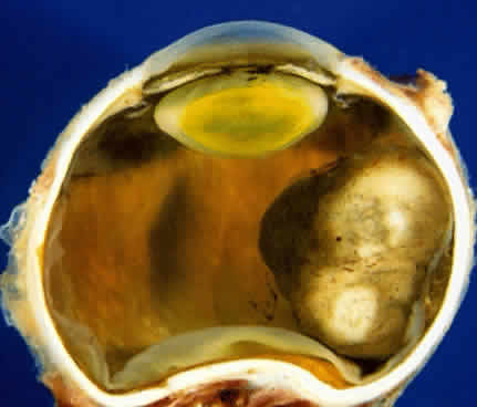 The growth patterns of choroidal melanoma can be best appreciated by examining gross sections of eyes enucleated for this disease. The tumors can either be dome shaped and deeply pigmented (Fig. 13) or amelanotic. The mushroom-shaped tumor typically produces a secondary nonrhegmatogenous retinal detachment (Fig. 14).