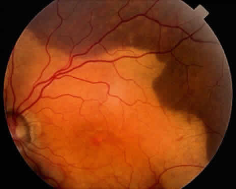 Ciliary body melanoma is best diagnosed by recognition of the typical features of the tumor with slit-lamp biomicroscopy or indirect ophthalmoscopy through the widely dilated pupil. If the tumor is of sufficient size, ultrasonography may show the typical features of a uveal melanoma. In cases where the diagnosis is quite difficult, fine-needle aspiration biopsy can be used4; however, this is a difficult diagnostic technique that requires considerable experience to perform. Ciliary body melanoma is most often managed surgically by local removal of the tumor via partial lamellar iridocyclectomy or some variation thereof.10 This technique is described in the literature and is beyond the scope of this discussion. Tumors that are too large to resect locally may require treatment with either a radioactive plaque or enucleation. CHOROIDAL MELANOMA A choroidal melanoma is a malignant melanocytic tumor that arises from the melanocytes within the choroid.7 Like ciliary body melanoma, it contains spindle cells, epithelioid cells, or a combination of the two (mixed-cell type). In its earliest stages, a malignant choroidal melanoma may be clinically indistinguishable from a large benign choroidal nevus. A small choroidal melanoma characteristically occurs as a black or gray choroidal mass with fairly well-defined borders. A typical early feature is the orange pigment on the surface of the tumor (Fig. 10). This correlates with clumps of macrophages at the level of the retinal pigment epithelium that contain abundant lipofuscin pigment. A larger melanoma usually assumes a dome shape (Fig. 11). A melanoma that is clinically amelanotic is characterized by large, visible blood vessels in the substance of the tumor. A choroidal melanoma can eventually break through Bruch's membrane, assuming a mushroom-shaped configuration (Fig. 12).