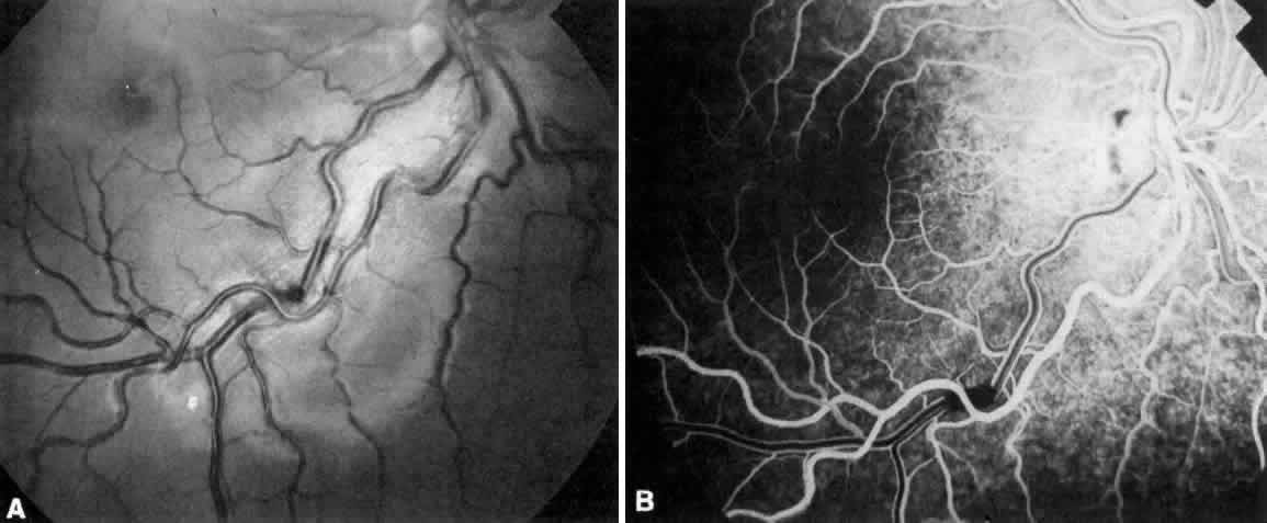 Primarily arteriolar tortuosity is noted in patients who have aortic coarctation.77 Arteriolar constriction and arteriovenous crossing changes are rare in hypertensive patients who have aortic coarctation; hemorrhage and cotton-wool spots (retinal nerve fiber layer infarcts) are absent. Another feature of arteriolar tortuosity in patients who have aortic coarctation is the diffuse nature of the arteriolar tortuosity, perhaps resulting from wide pulse pressure; patients who have systemic hypertension from other causes generally have perimacular arteriolar tortuosity. Acute superior vena caval ligation has been reported to increase intraocular pressure and cause bilateral glaucomatous optic nerve atrophy78; the pressure increase was reversible on ligation reversal. Acute SVC obstruction may also cause exophthalmos, periorbital eyelid ecchymoses, and conjunctival chemosis with hemorrhage. Retinal venous engorgement with disc margin blurring has been described. Although SVC obstructive syndrome after Mustard and Senning procedures, Glenn anastomosis, and Fontan procedure may be noted, it is rare for postoperative glaucoma to occur in children; perhaps adaptive mechanisms avert sustained elevated intraocular pressure. Because lengthy postoperative observation has been limited, patients who have SVC hypertension warrant closer ophthalmologic evaluation. |