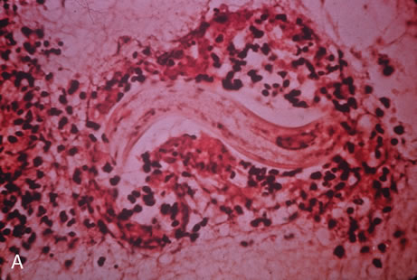Histologically, the tracks of migrating larvae are marked by hemorrhagic necrosis and infiltration by eosinophils and lymphocytes. Remains of larvae are found within the granulomas, which contain closely packed eosinophils and histiocytes (Fig. 37).