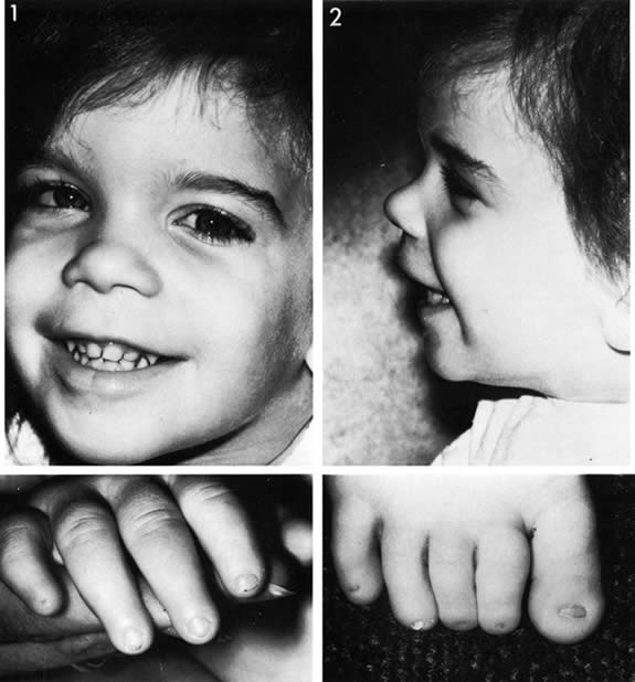 * The number of patients with each abnormality includes only those patients for whom a definite decision could be made. In nine instances, historical information on birth length was not available; eight children were evaluated in the neonatal period and postnatal growth could not be assessed. † Includes only children 4 years of age or older. Among the remaining 22 younger children, 3 show developmental delay. ‡ Includes one child with cleft lip and palate and one with submucous cleft and bifid uvula. One other child had only a bifid uvula. § Excludes mild or equivocal degrees. || Includes one case of atrial septal defect, ventricular septal defect, and pulmonic stenosis. (Used with permission from: Hanson JW, Myrianthopoulos NC, Sedgwick et al; Risks to offspring of women treated with hydantoin anticonvulsants, with emphasis on the fetal hydantoin syndrome. J Pediatr 89:662, 1976.)