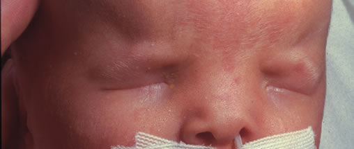 Ophthalmologic findings include hypertelorism, epicanthic folds, ptosis, strabismus, persistent hyperplastic primary vitreous, optic nerve coloboma, and optic nerve hypoplasia (Fig. 1).63,64,66–69 Glaucoma, prominent iris vessels, defective lacrimal apparatus, microphthalmia, retinoschisis, uveal and retinal coloboma, and retinal dysplasia have also been reported.67,69–73 Whether or not in utero exposure to phenytoin increases the likelihood of mental deficiency or learning disability remains unresolved.74,75 There may be an increased incidence of malignancies, especially of the neural crest, such as neuroblastoma.76 Trimethadione produces a pattern of malformation as shown in Table 2.77,78 Epicanthus and V-shaped eyebrows are frequent features (Fig. 2). Strabismus and myopia may be present.