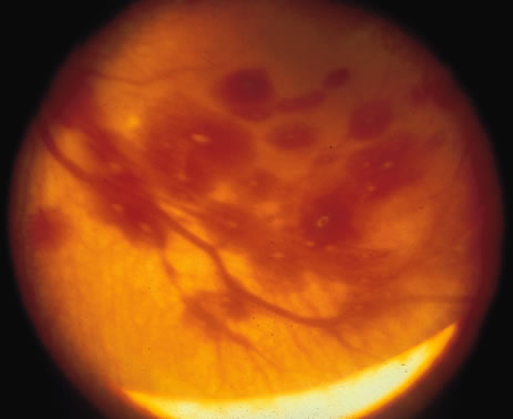 Puncture by amniocentesis needles or monitoring electrodes may also produce such trauma.172,173 Injury to virtually every anatomic component of the globe and ocular adnexa has been described.174 These range from clinically insignificant subconjunctival hemorrhage to total luxation of the globe.175 The following description is limited to clinically significant injuries that occur with some frequency. Corneal opacification may be caused by direct epithelial and stromal injury or may be secondary to rupture of Descemet's membrane. Fortunately, both types are usually unilateral. Direct epithelial and stromal injury is usually associated with evidence of lid trauma and subconjunctival hemorrhage. It clears rapidly, usually by 1 week of age. Descemet's membrane ruptures result from deformation of the globe, most frequently because of direct compression by delivery forceps.176,177 The ruptures appear as curvilinear, frequently vertical, often crescentic striae, and consist of scroll-like detachments. Overlying stromal opacification may or may not be present at birth. As endothelial regeneration and Descemet's membrane reduplication occur, clearing of the cornea ensues. High corneal astigmatism and myopia may result from Descemet's breaks and, if uncorrected, may be amblyogenic.178 Decompensation with gutatta may result in overlying opacification decades later.179 Intraocular hemorrhage is frequently observed in neonates, most commonly as retinal hemorrhage. Hyphema and intravitreal hemorrhage are rarely encountered, usually after significant direct forceps or vacuum extraction trauma. Congenital hyphema has occurred after normal spontaneous deliveries.180 Intravitreal hemorrhage has been reported in the coagulation dysfunction associated with protein C deficiency.181 Retinal hemorrhage occurs with a reported frequency ranging from 2.6% to 50%.182,183 Intraretinal hemorrhages (flame-shaped, dot-blot, and larger dot-blot with white centers) are most commonly seen in the posterior pole but can be seen anteriorly (Fig. 8). Subhyaloid and subretinal hemorrhages occur much less frequently.